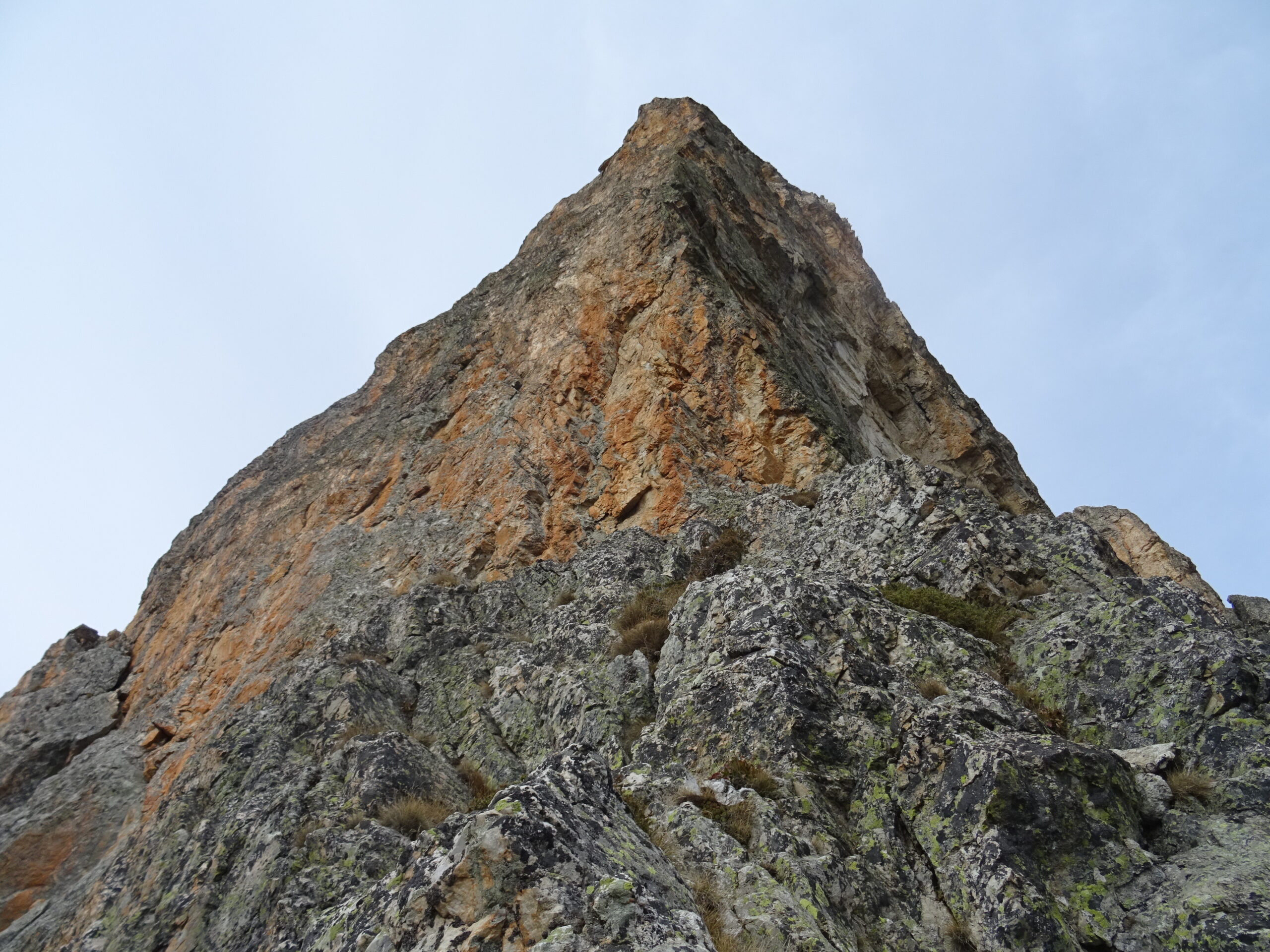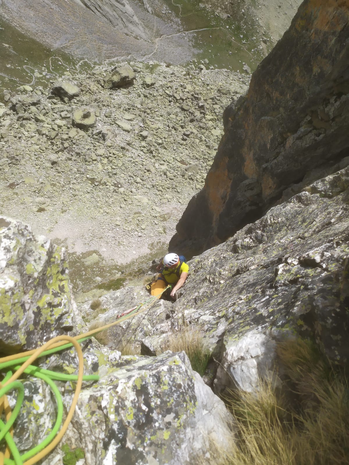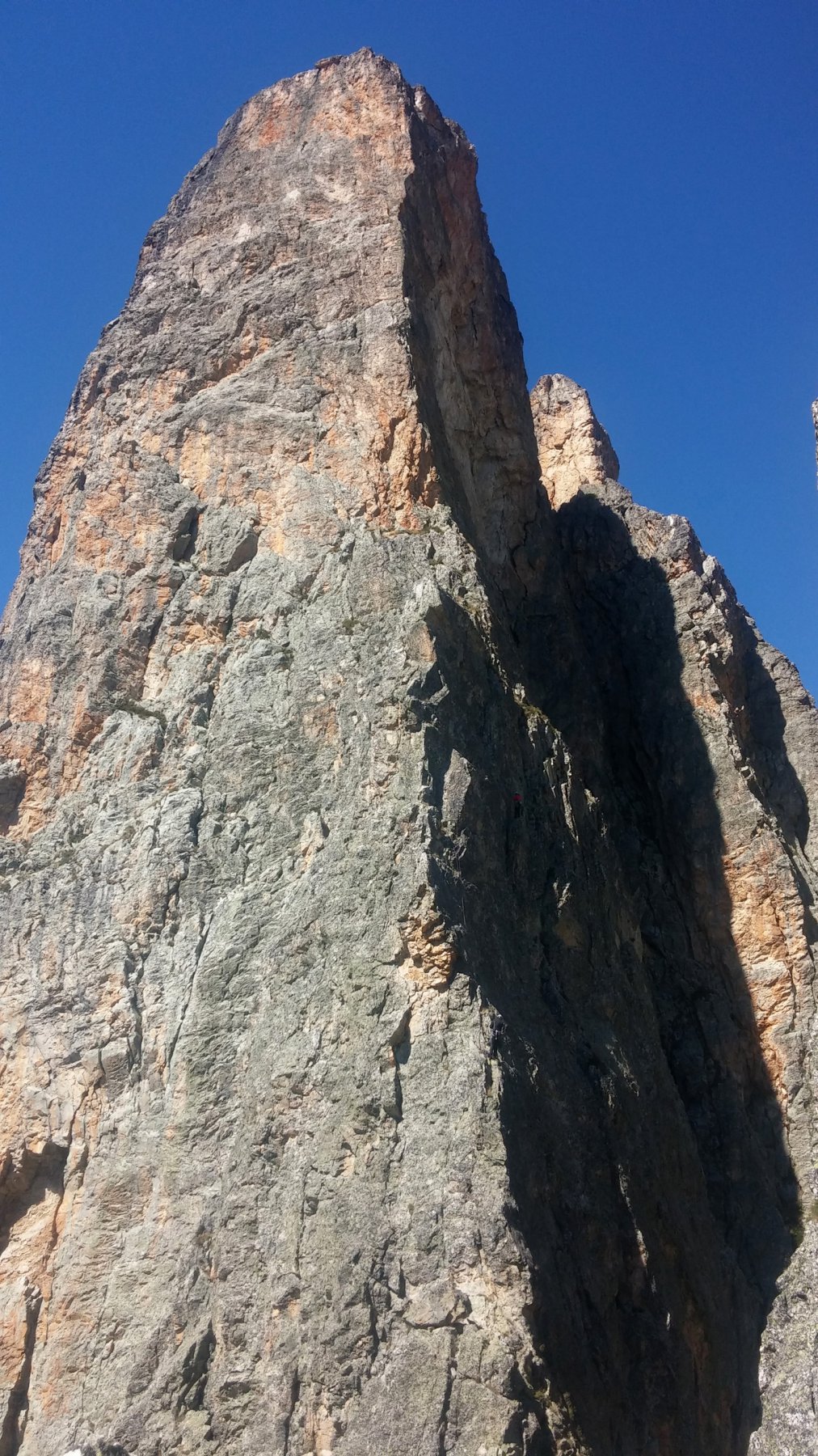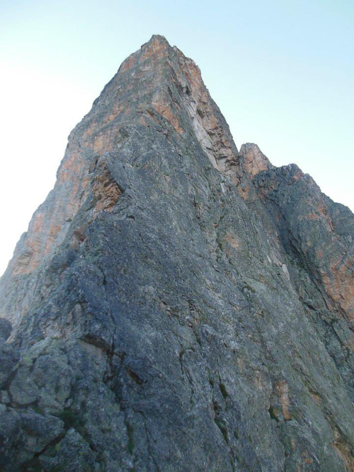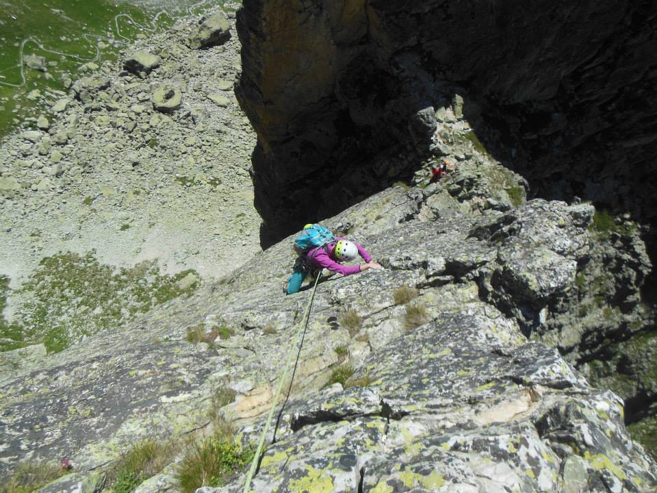 - L5: riprendere la fessura a sinistra e seguirla fino a raggiungere la cresta erbosa, piegando leggermente verso destra. Tiro di raccordo tra la fessura Brunilda e lo Spigolo Castiglioni. Sosta alla base dello spigolo Castiglioni in cima alla cengia erbosa su uno spigolo di roccia gialla-rossa. 35 metri. 4c. Un fix e un chiodo.
