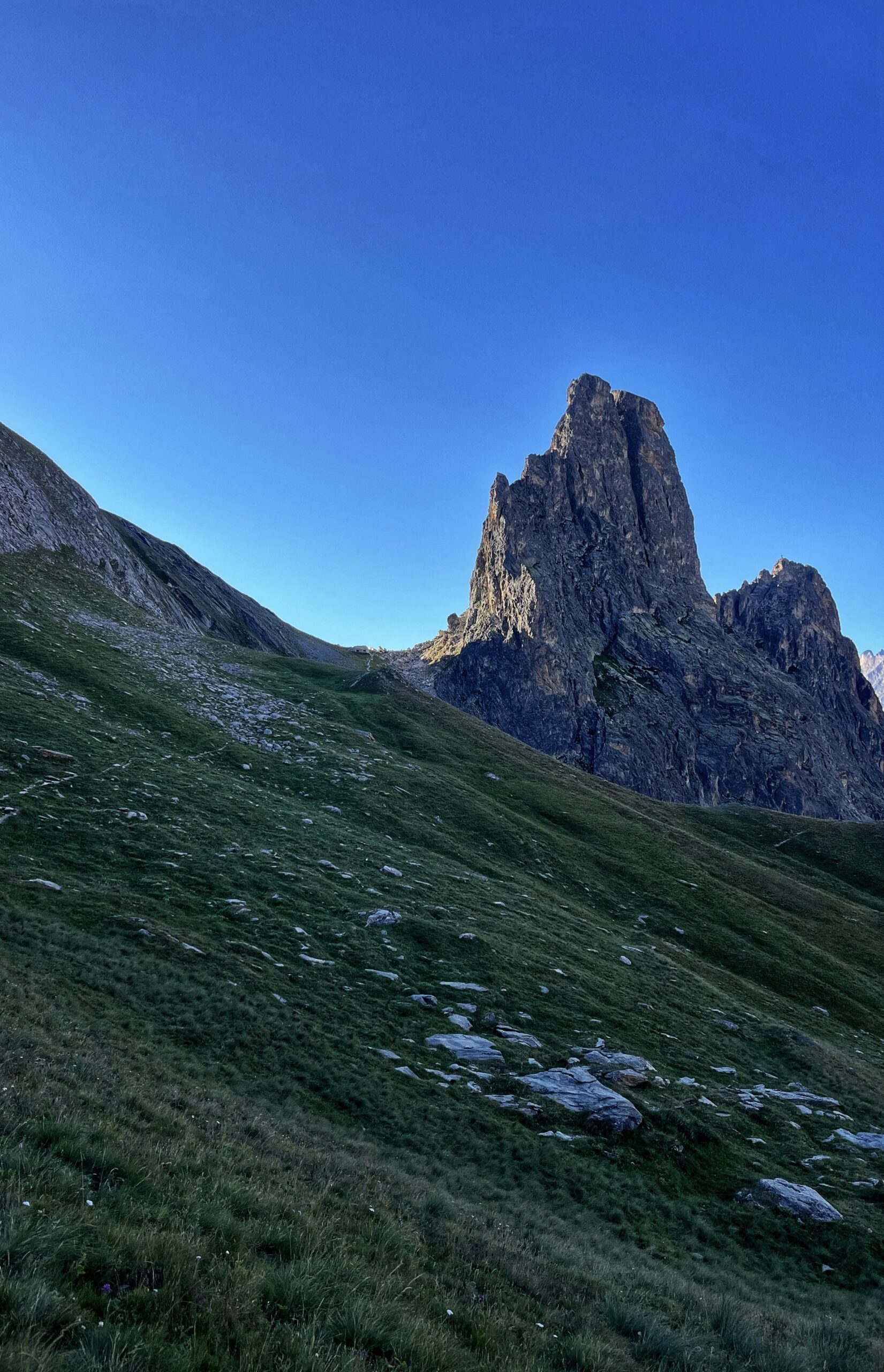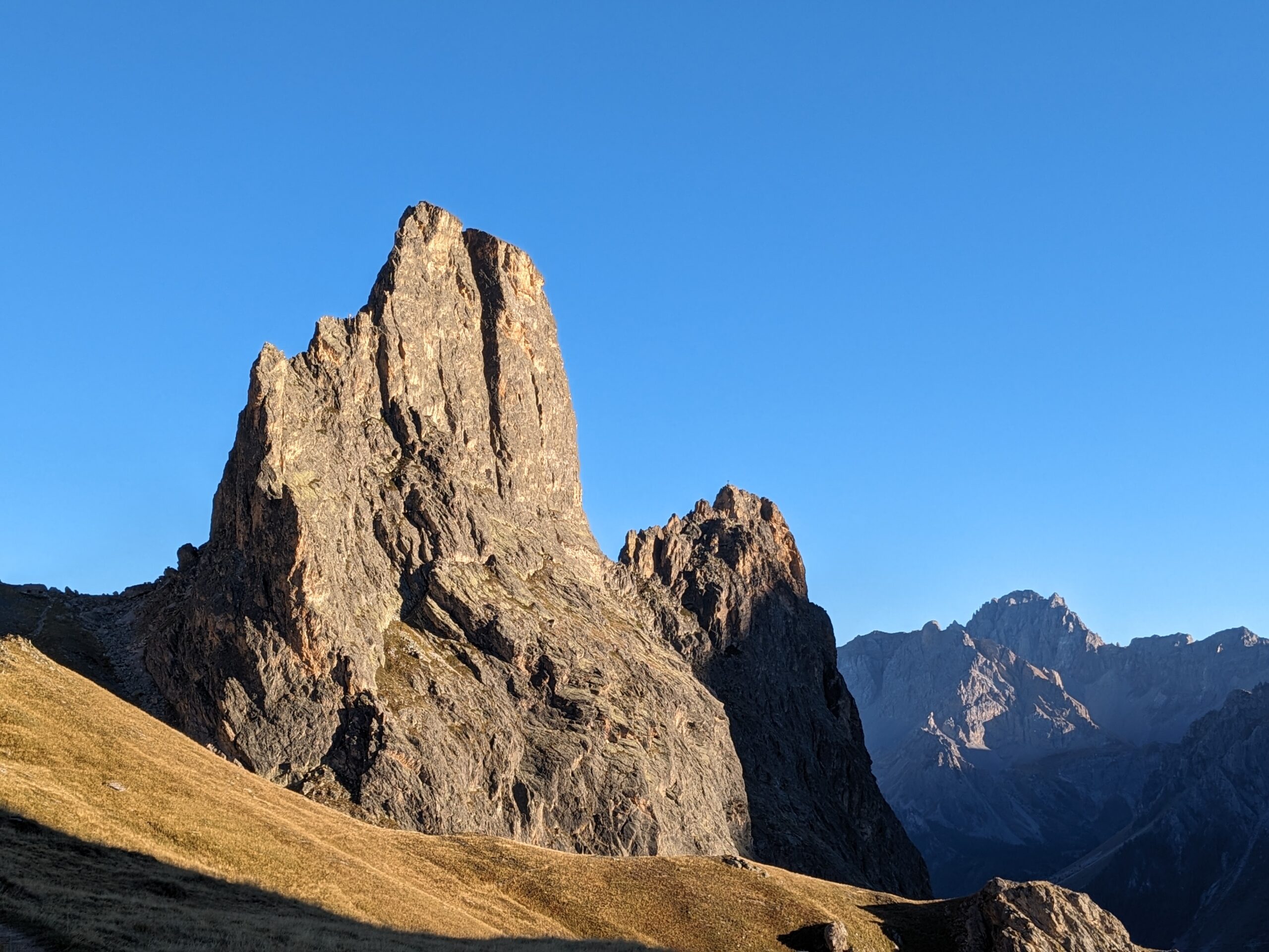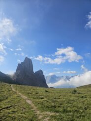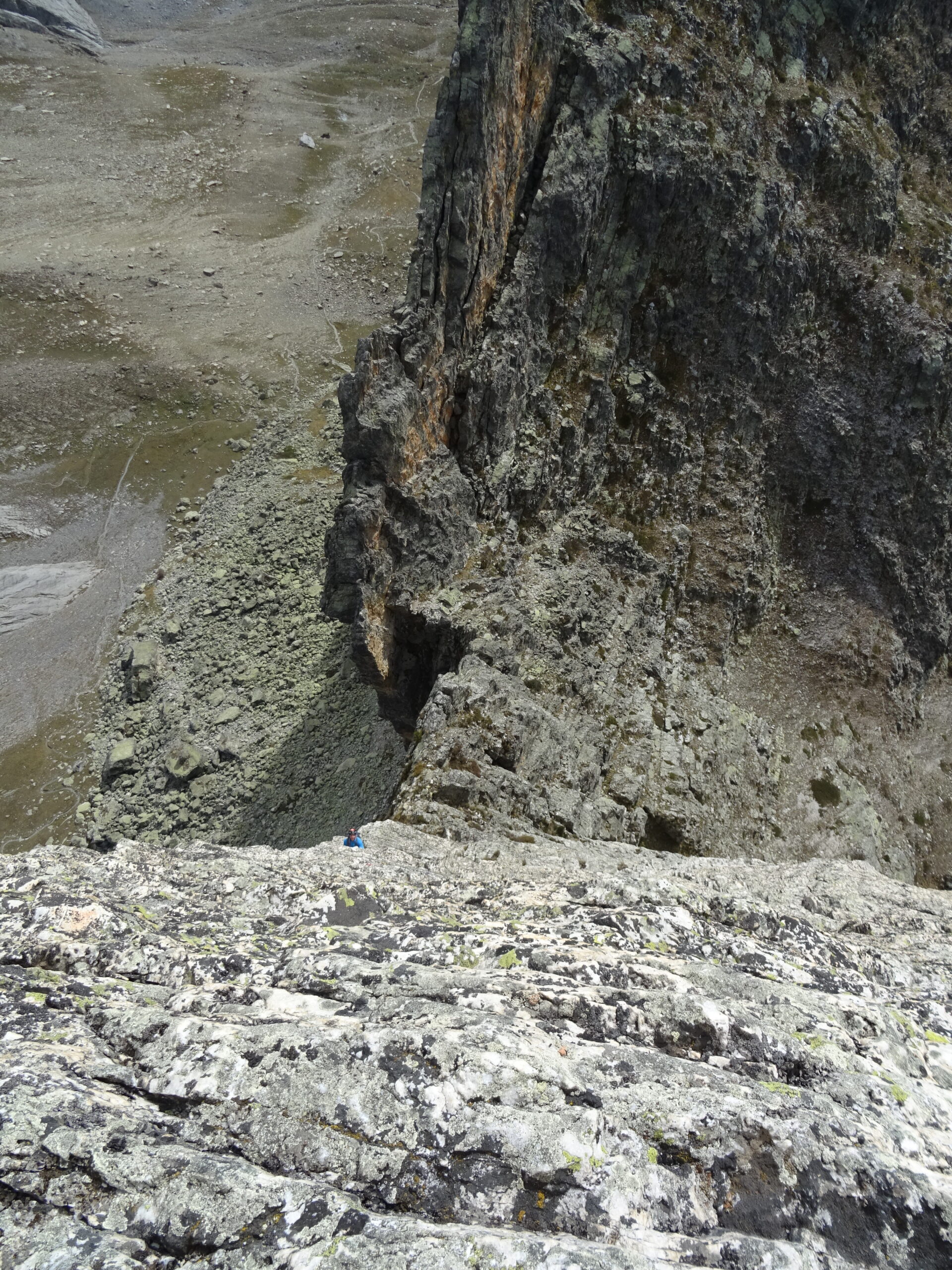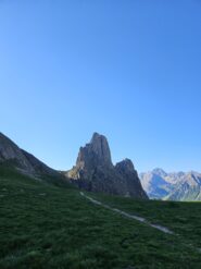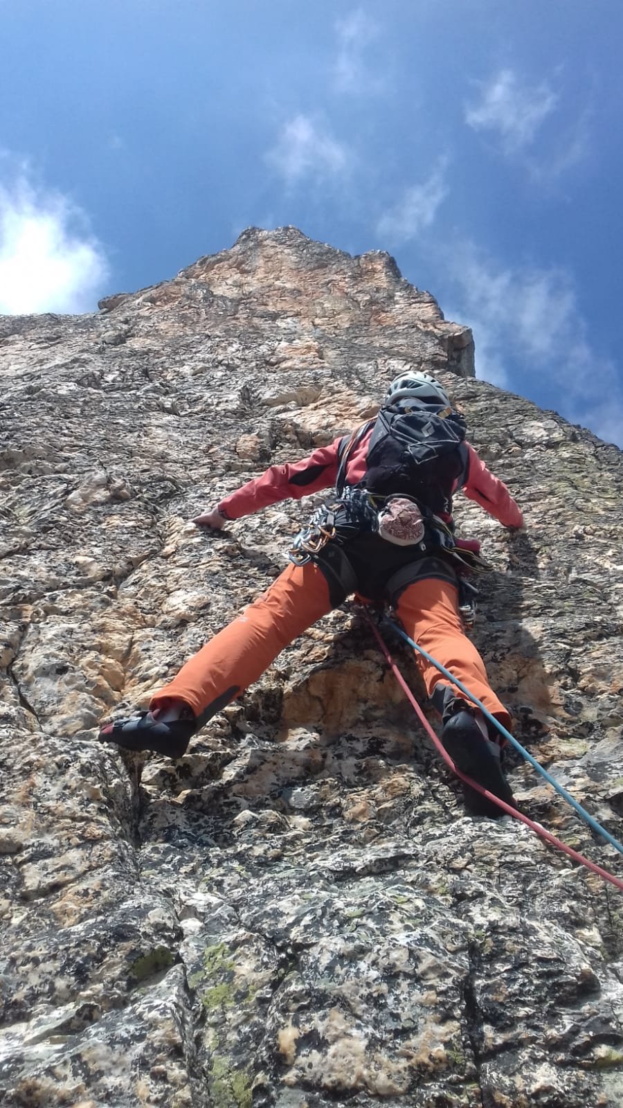 - L5: riprendere la fessura a sinistra e seguirla fino a raggiungere la cresta erbosa, piegando leggermente verso destra. Tiro di raccordo tra la fessura Brunilda e lo Spigolo Castiglioni. Sosta alla base dello spigolo Castiglioni in cima alla cengia erbosa su uno spigolo di roccia gialla-rossa. 35 metri. 4c. Un fix e un chiodo.