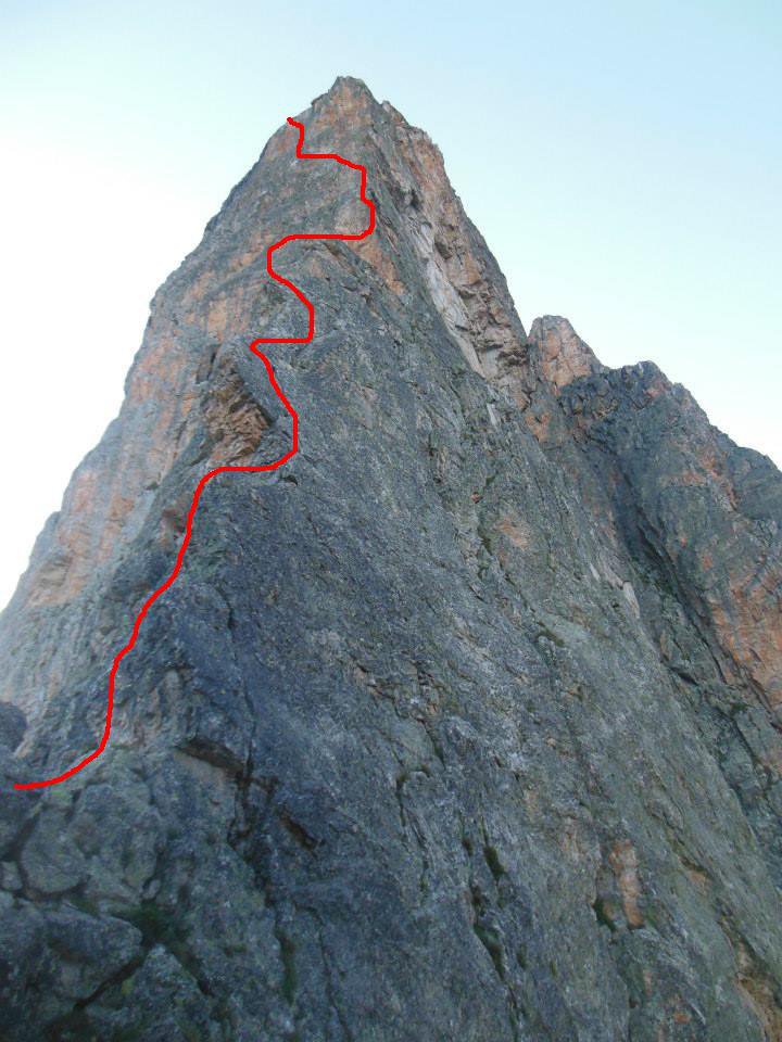 Per accedere alla via è necessario scalare il “Camino Est” (G.Gervasutti e Re Alberto dei Belgi, AD+, 90m, 4 tiri, soste a spit) o la Fessura Brunilde che porta alla Forcella Provenzale, da dove si attacca lo spigolo. Esso presenta 6 tiri sul quinto grado attrezzati con vecchi chiodi e difficilmente proteggibili altrimenti. Qualche spit in via. Soste riattrezzate a nuovo con spit da 10mm.