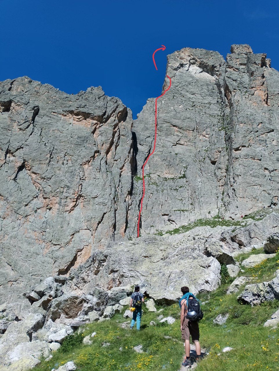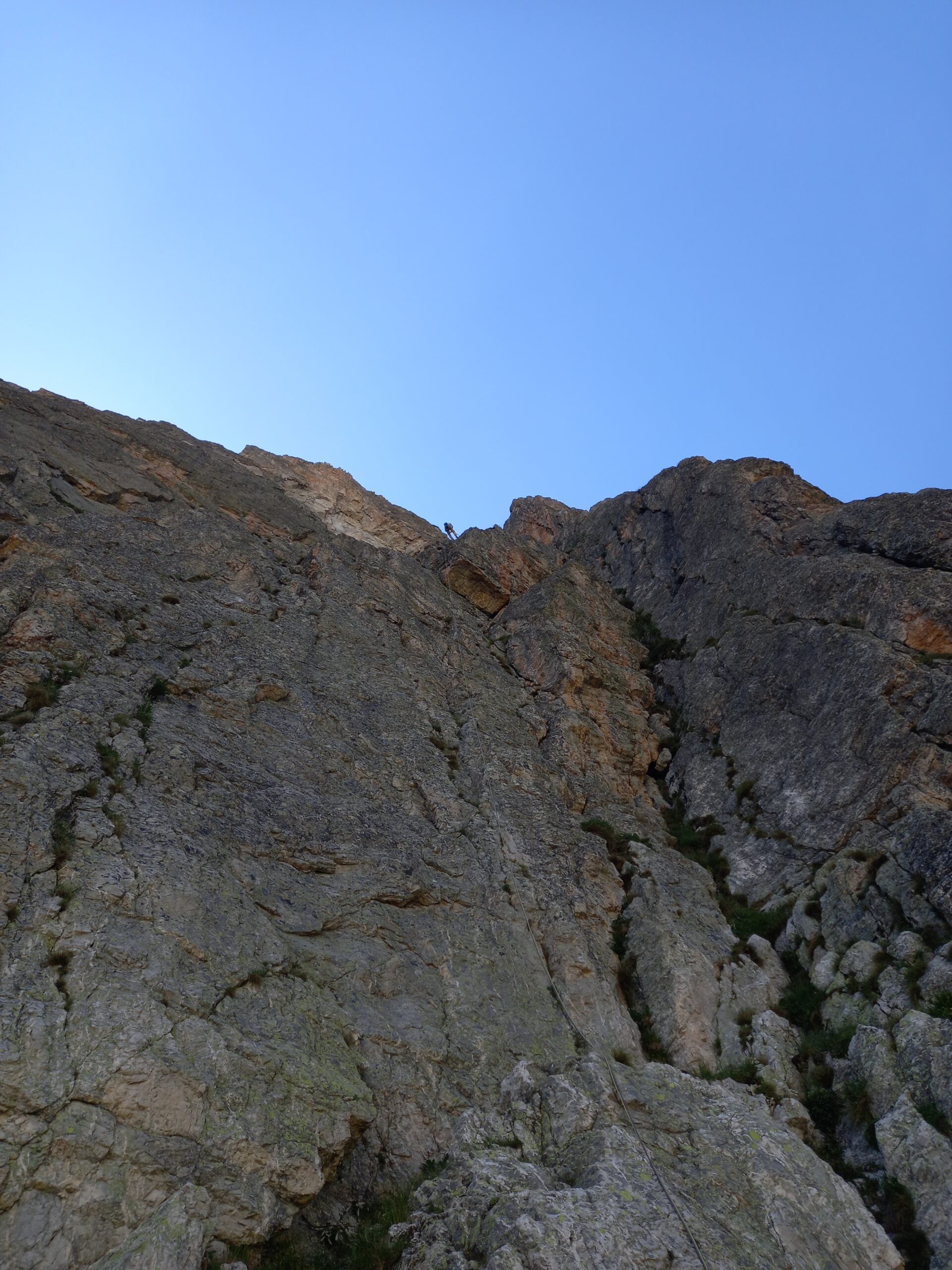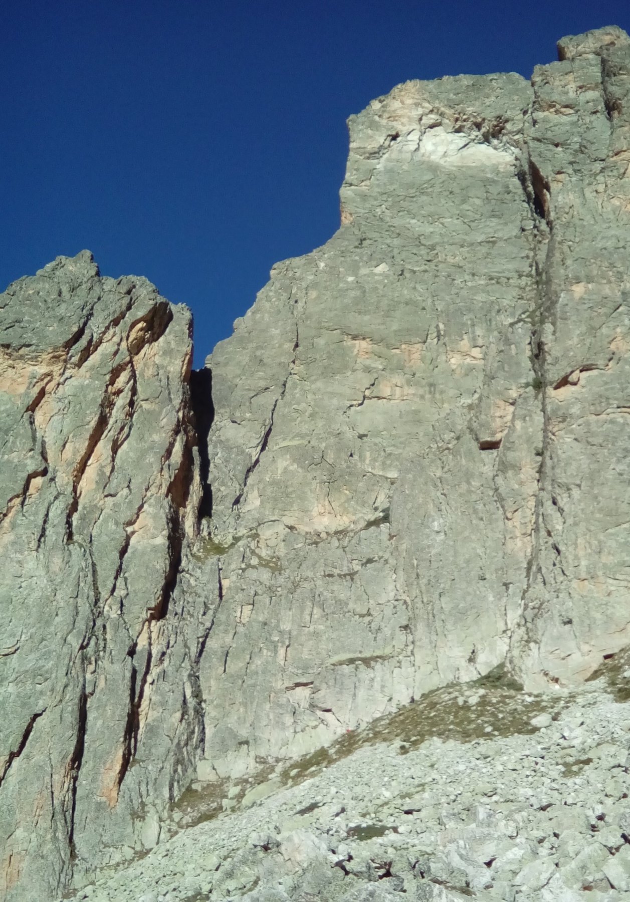 - L1: attaccare lo zoccolo sotto l’evidente fessura. Primi metri non banali, uscire sul terrazzo al di sopra e attaccare il camino. A 30 metri circa dalla partenza si raggiunge una prima sosta, oltrepassarla e continuare per un muretto fino alla cengia erbosa, in cima alla quale si sosta. 50 metri, 5c/5c+ in partenza, poi 5a; 5 chiodi.