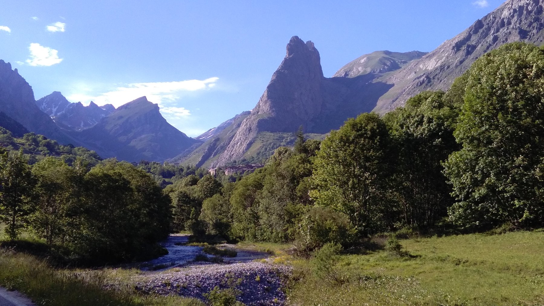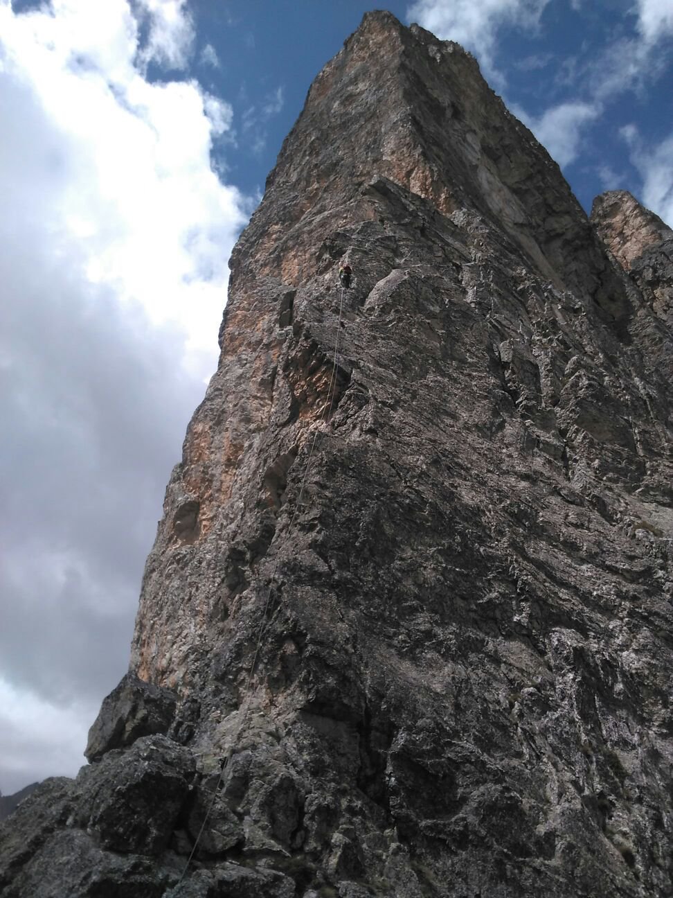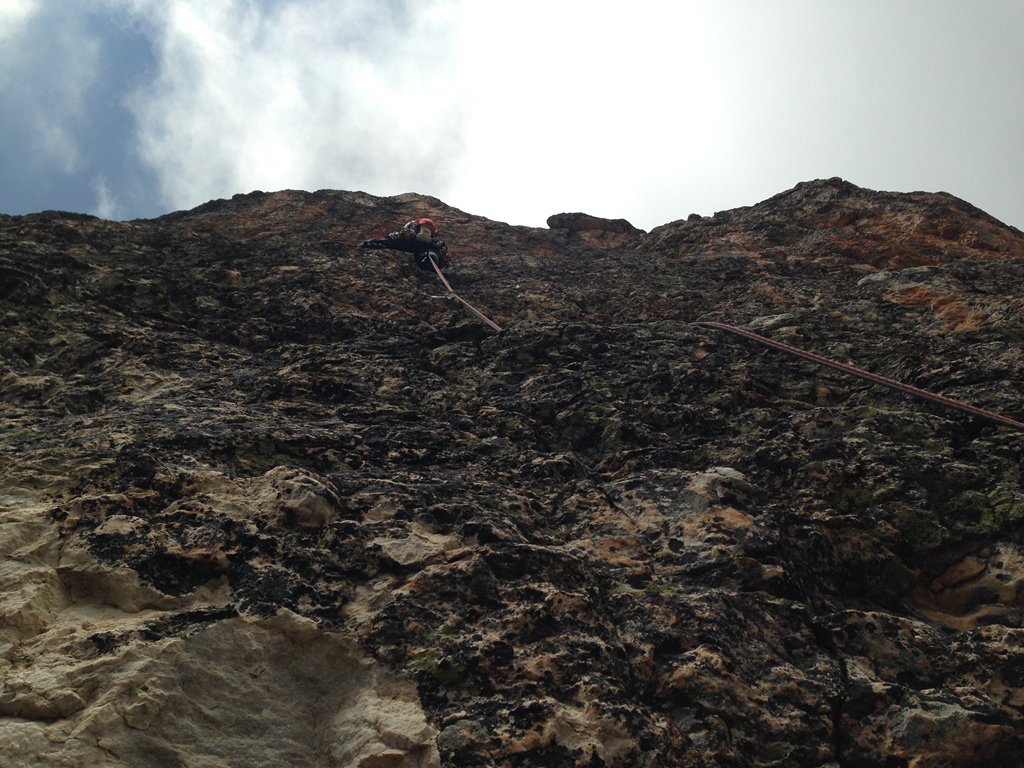 - L1: attaccare lo zoccolo sotto l’evidente fessura. Primi metri non banali, uscire sul terrazzo al di sopra e attaccare il camino. A 30 metri circa dalla partenza si raggiunge una prima sosta, oltrepassarla e continuare per un muretto fino alla cengia erbosa, in cima alla quale si sosta. 50 metri, 5c/5c+ in partenza, poi 5a; 5 chiodi.