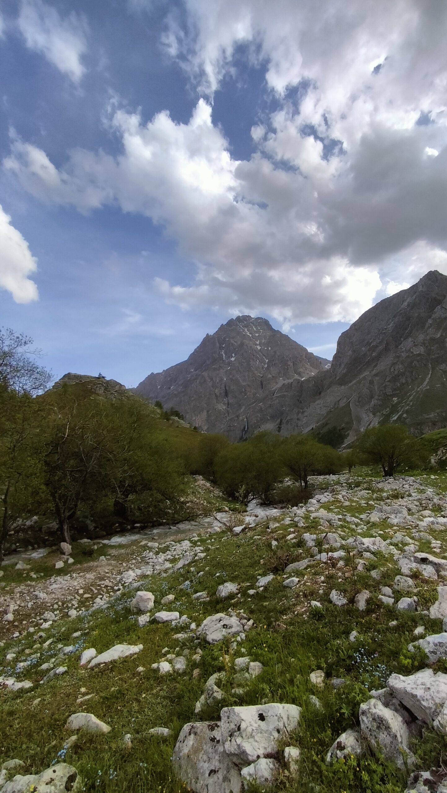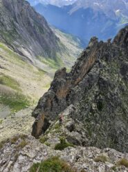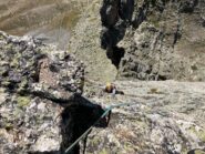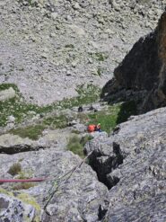 - Seguire il camino sino a metà, dove a sx c’è un grande masso con catena intorno, su chi si sosta (30 m, IV). Poi salire alla forcella a sx dove si sosta. 3 spit+catena+maglie rapide. (25 m, III, 2 chiodi)