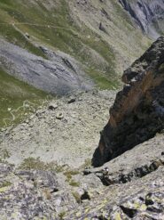 - Poi con breve tiro salire muretto che conduce a ghiaioncello alla base del camino dove ci si ricongiunge con l’originale e si sosta (3 spit+catena+maillon, 20 m).