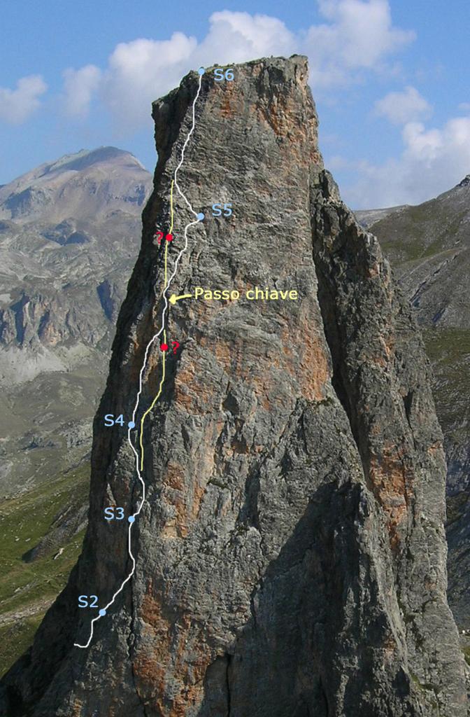 Salire il diedro aperto e fessurato sopra la sosta (chiodo) sino alla base del muro strapiombante rossastro; aggirarlo sulla destra (chiodo) e proseguire direttamente su terreno leggermente strapiombante ma provvisto di buone prese (passo chiave di 15m, chiodi), sino ad uscire per fessura ascendente verso dx su placche meno inclinate. A questo punto salire verticalmente per una decina di metri e poi traversare 4 metri a destra in prossimità di un vecchio chiodo a lama (rosso). S5, 50m (IV,6a,IV).