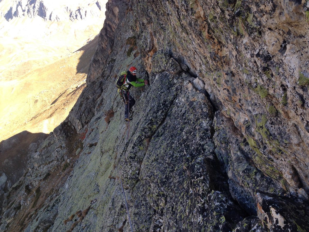 Dalla sosta traversare orizzontalmente, seguendo un sistema di lame e fessure, fino quasi a raggiungere la base dello spigolo. S2, 40 m (II+)
