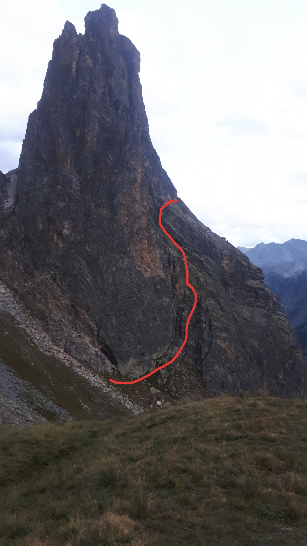 Avvicinarsi allo spigolo ascendendo verso sinistra su di una falsa cengia di placche inclinate, superare uno strapiombo nerastro (chiodi) e proseguire con magnifica arrampicata direttamente fino in vetta. S6, 35m (IV+).