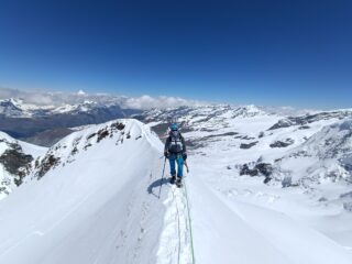 Condizioni del ghiacciaio molto buone con neve trasformata e due dita di farina.