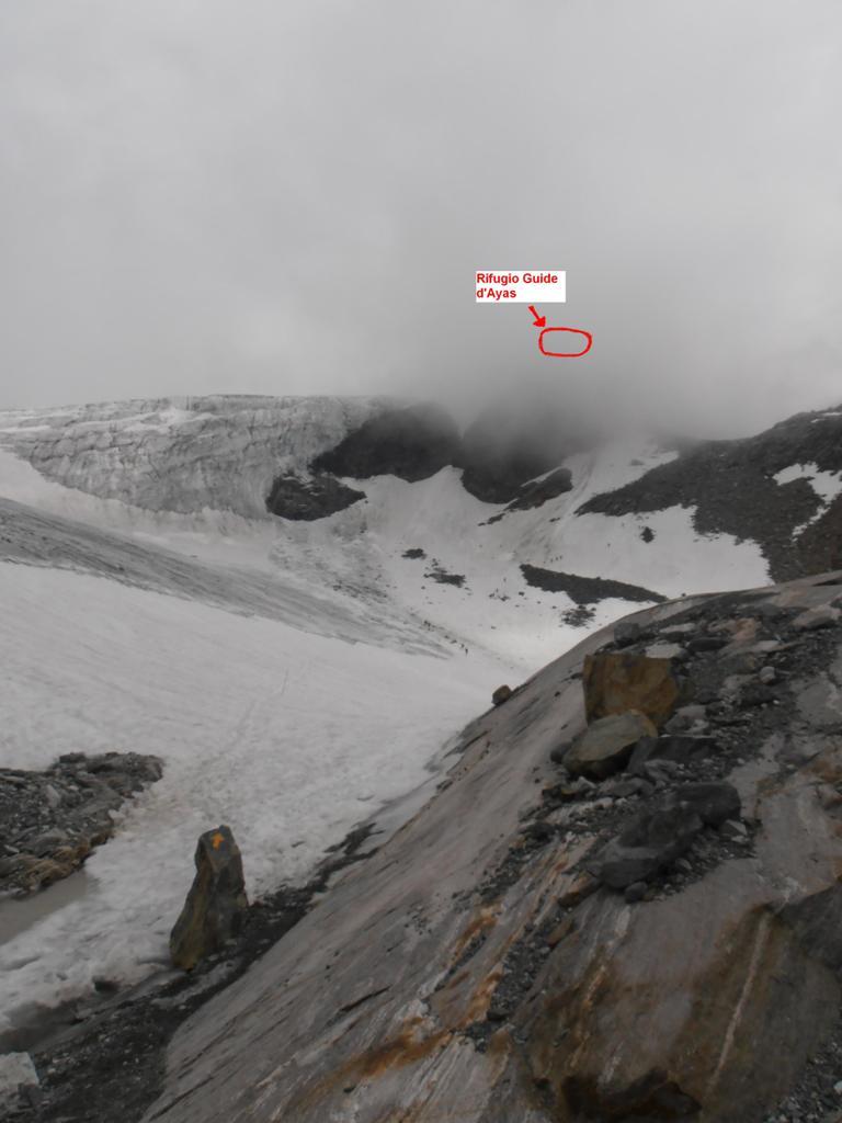 I giorno: da Saint Jacques per strada fino al Pian di Verra superiore (circa 2300 m, servizio jeep), poi per sentiero comodo su morena al rifugio Mezzalama (m 3004) e proseguendo per morena, bordo del ghiacciaio e successivo pendio di sfasciumi fino al rif. Guide Ayas (m 3424)