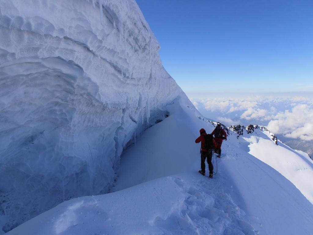 II giorno: dal rifugio per ghiacciaio (crepacci) si risale il gh. di Verra fino alla base del Polluce e poi ai pressi del Colle di Verra. Si risale il pendio del versante NW del Castore, via via più ripido, salendo a zig zag fra i crepacci.