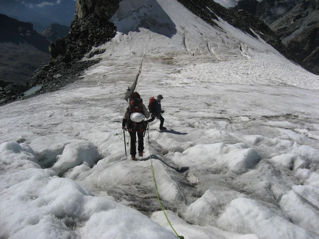 dal rifugio si rimonta il ghiacciaio del Felik in direzione nord, passando alla base della punta Perazzi.