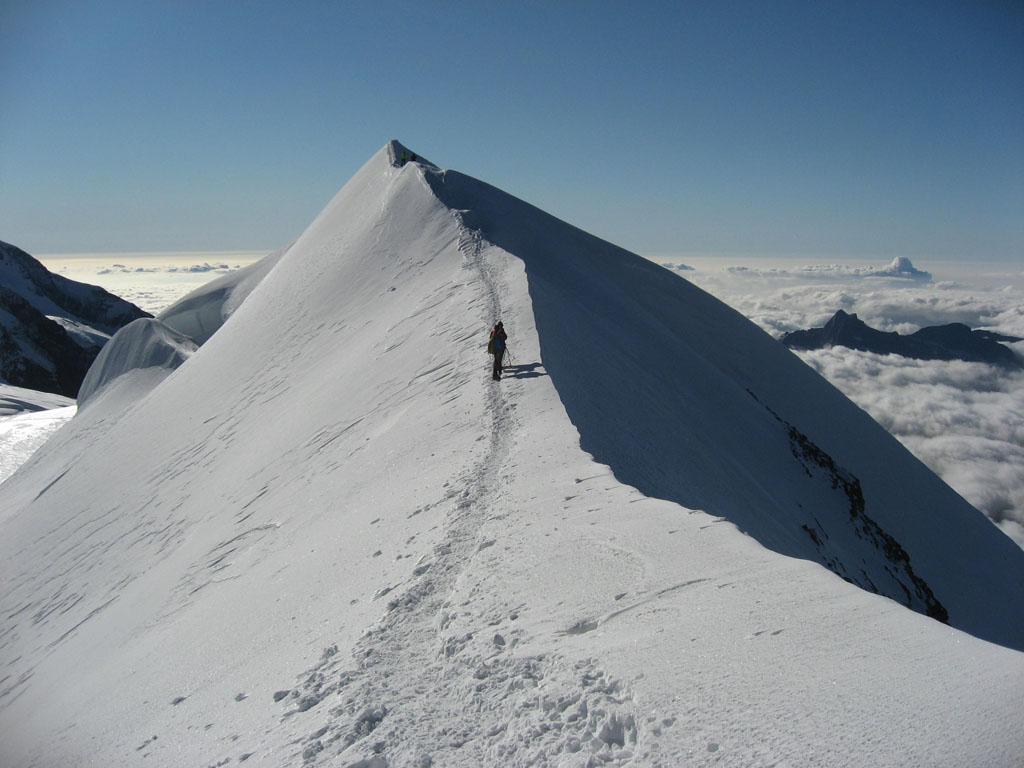 Si va poi a nord ovest e si segue la aerea cresta di frontiera, sottile in alcuni tratti, e si tocca infine la vetta.