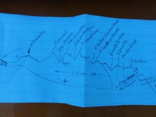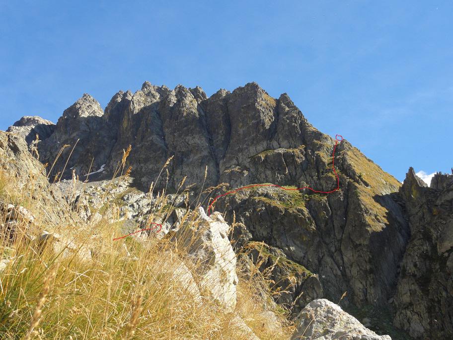 Da qui ci si porta ai piedi della catena e, sfruttando un cengione erboso fino al suo termine, si raggiunge un facile canale che porta in cresta.