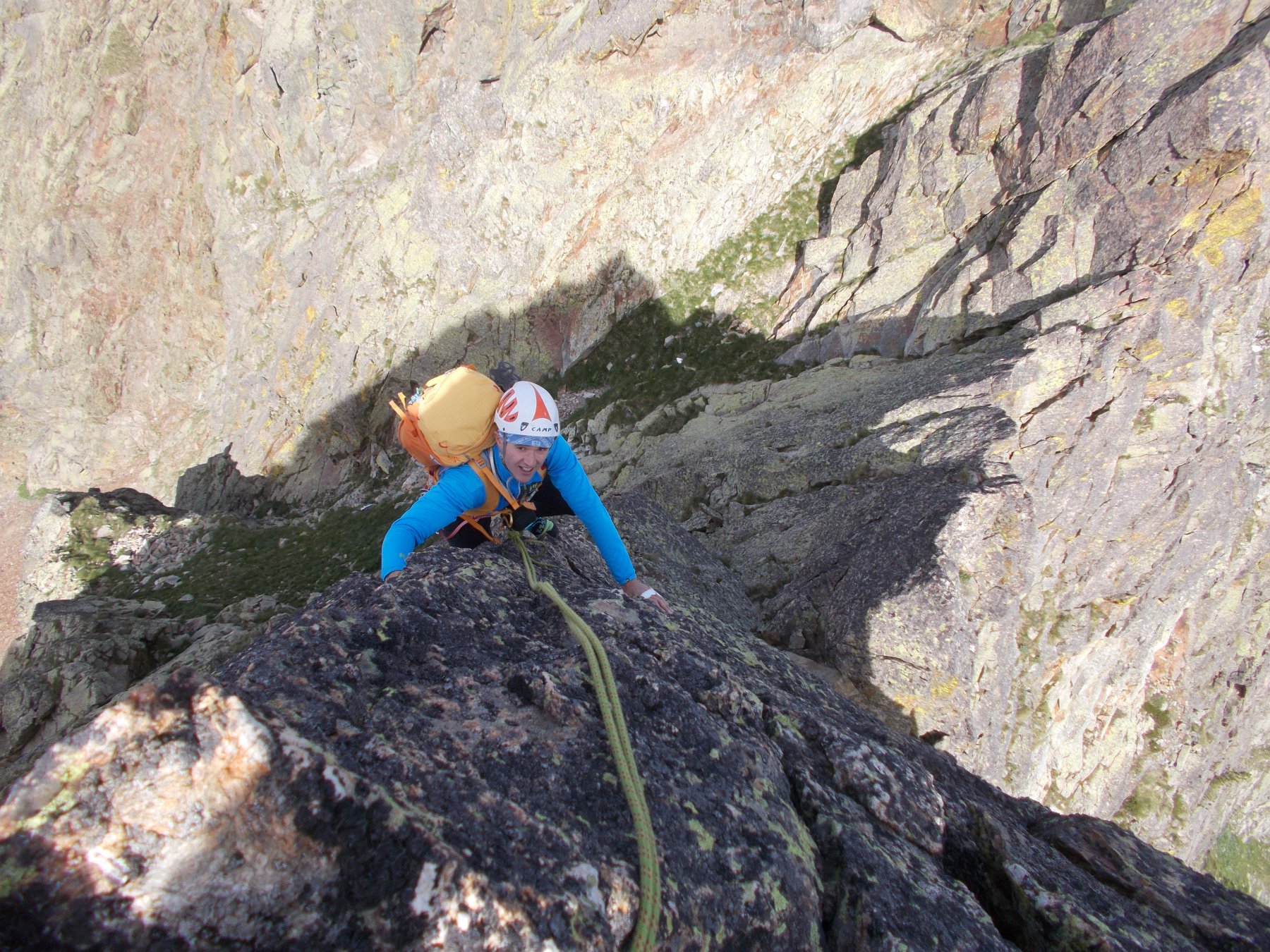 Come si possa arrivare a banalizzare una traversata dai connotati esclusivamente alpinistici (avvicinamento dal basso scarsa chiodatura, per non dire nulla del tutto, otto ore minimo di cresta, almeno una dozzina di doppie), riducendola alla stregua di una semplice arrampicata, sinceramente non capisco. Forse perche’ posto nel regno dell’arrampicata per eccellenza delle Marittime, si e’ pensato di dare una connotazione unica al tutto, senza tenere conto minimamente della differenza che sussiste tra semplice arrampicata e fare alpinismo, che e’ ben altra cosa. Partenza ore 4 dal Gias delle Mosche, in meno di due ore al Bozano. Sono le 6 (ancora tutti dormono), per arrampicare non c’e’ bisogno di alzarsi poi cosi’ tanto presto (primo fattore di comodita’). Dal canale a ridosso del rifugio a prendere la cresta un ora da aggiungere, per fare gia’ 3, ma ben altre sette (quelle citate poi nella guida GMI ) c’e ne occorreranno per portare a termine la quasi eterna cavalcata Irta e costellata di cime, vuoto da vertigini, doppie in successione continua..e aggiungiamo.. molta arrampicata, chiodatura carente (un solo spit alla base della Plent). Tanta conserva protetta, una lama orizzontale di 40m da brivido. In arrampicata soltanto, tutti questi problemi trovano difficilmente riscontro. Aggiungiamo pure il vento a complicare ultriormente la situazione, a prospettarsi critica in ogni istante della traversata. Il meteo e’ stato dalla nostra parte. Per fortuna almeno quello. 22 ore non stop, tra viaggio d’andata, avvicinamento. traversata, discesa, e viaggio di rientro in tarda serata. Chi arrampica soltanto, di certo non si va a fare dei mazzi di questo genere. In alpinismo una AD+, gradazione a mio avviso un po stetta. Piu’ consona una D-. poiche’ vanno tenuti in debito conto altri fattori ambientali tipo, la quota, vento gelido, roccia sporca (lichene in gran quantita’) e malsana, senso di isolamento etc etc.