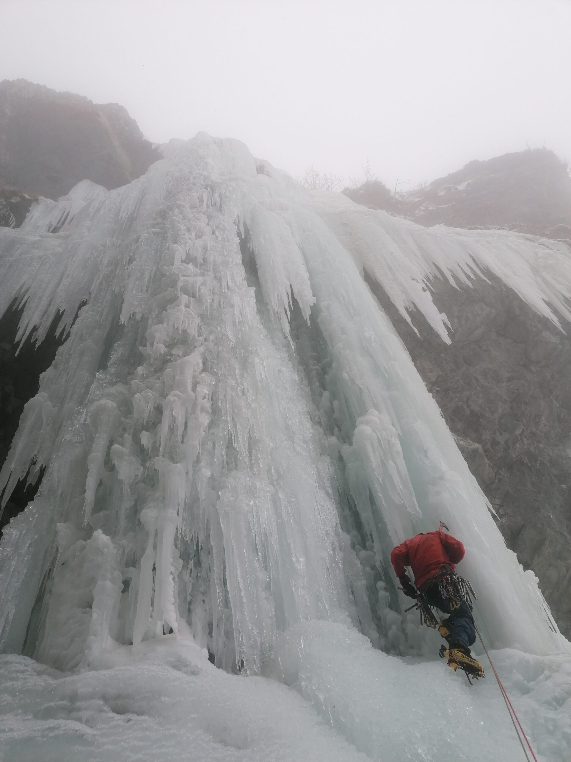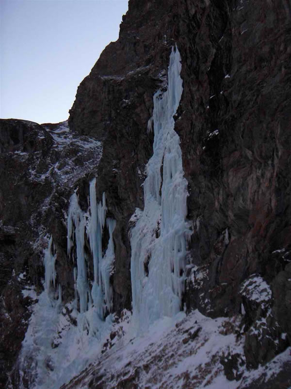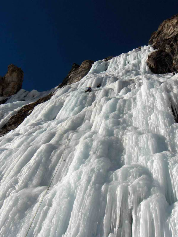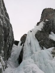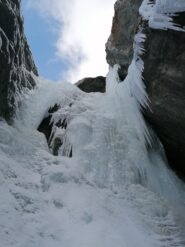 Alla sua sx si forma un’altra colata di egual lunghezza che si può spezzare in due tiri: il primo di 20/25mt fino ad una nicchia, il secondo composto da una colonna a 90° per 10/15mt…