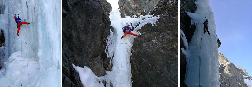 Cascata in buone condizione (come un frigorifero), ghiaccio buono e sicuro (presenta una crepa, ma è ben saldata). Abbiamo saliti diverse linee sul muro principale, anche la bella colonna formata a sinistra, in realtà un ice-park naturale.