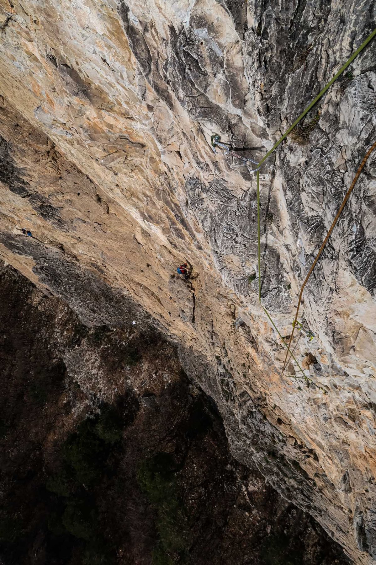 - L2 – 6b+, 40m – Su per il diedro-fessura aggettante e fisico per i primi metri. Dopodichè si continua su una placchetta aggettante con una sezione obbligata su piccole prese leggermente a sx dalla quale si esce in traverso verso destra.