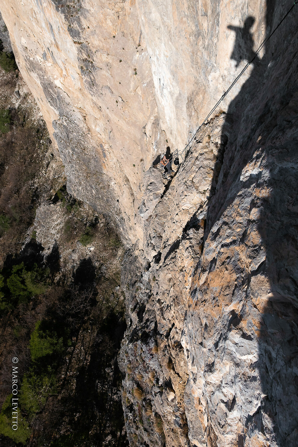 - L1 – 5c, 35m – muro grigio verticale con passi tecnici (originariamente si saliva stando sulla destra). Sosta su terrazzino.