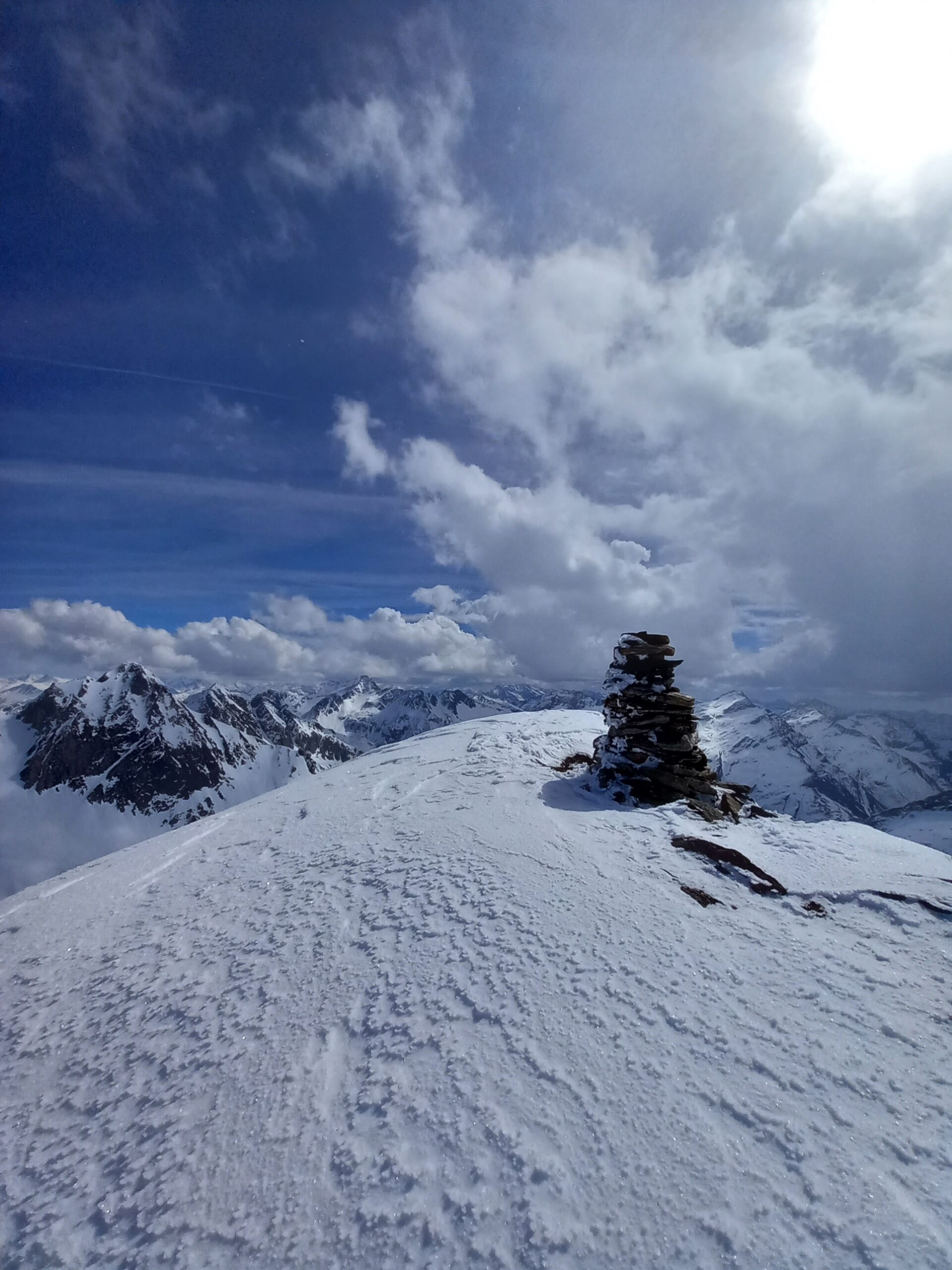 Quindi ringrazio ed evito, decidendo di salire la facile cima alle spalle che poi scopro chiamarsi Pizzo Cavagnöö. In cima si arriva a piedi per mancanza di neve,