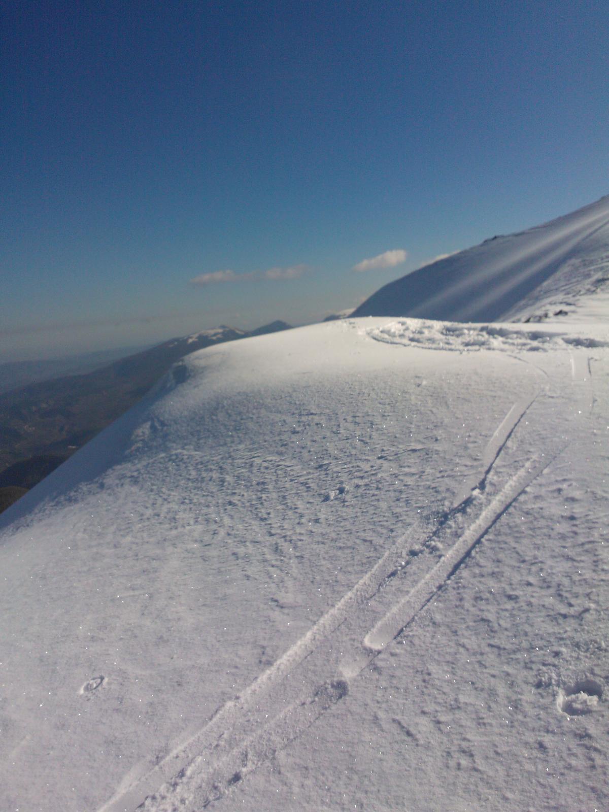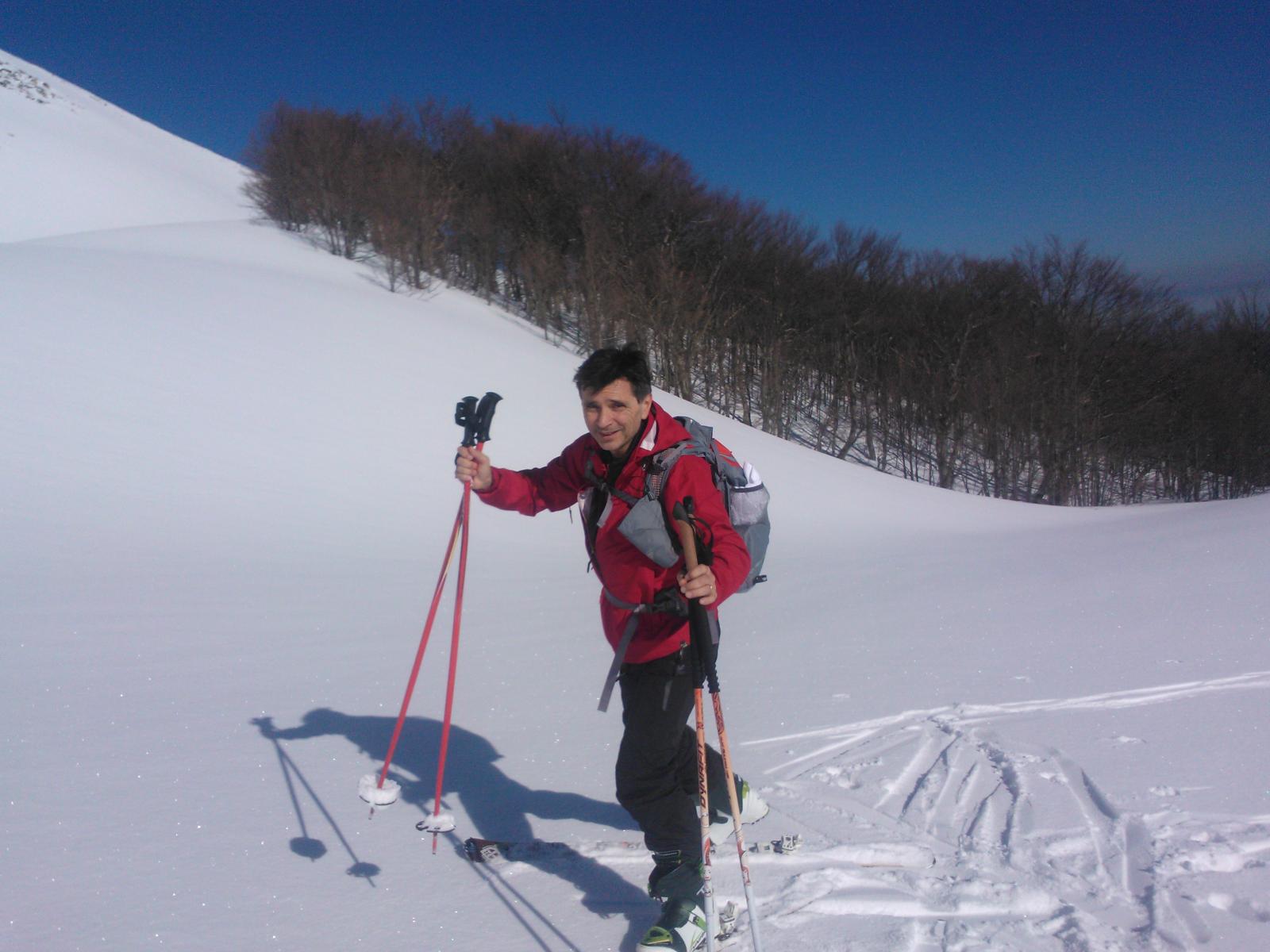 giornata bellissima , tersa, vento moderato, splendida farina per la nevicata del venerdi’ notte,. il bosco di faggi a piante rade, offre pendenza poco accentuate ma risulta divertente. ultimo km su strada in falso piano.il circo glaciale sommitale oggi era in condizioni perfette. 10 cm di farina su fondo trasformato. sceso il canale centrale . quello sotto la verticale della vetta e’ piu’ sostenuto.Con neve molto dura o ghiaccio necessari ramponi e piccozza per la cresta finale ,oggi agevole per buone condizioni del manto
