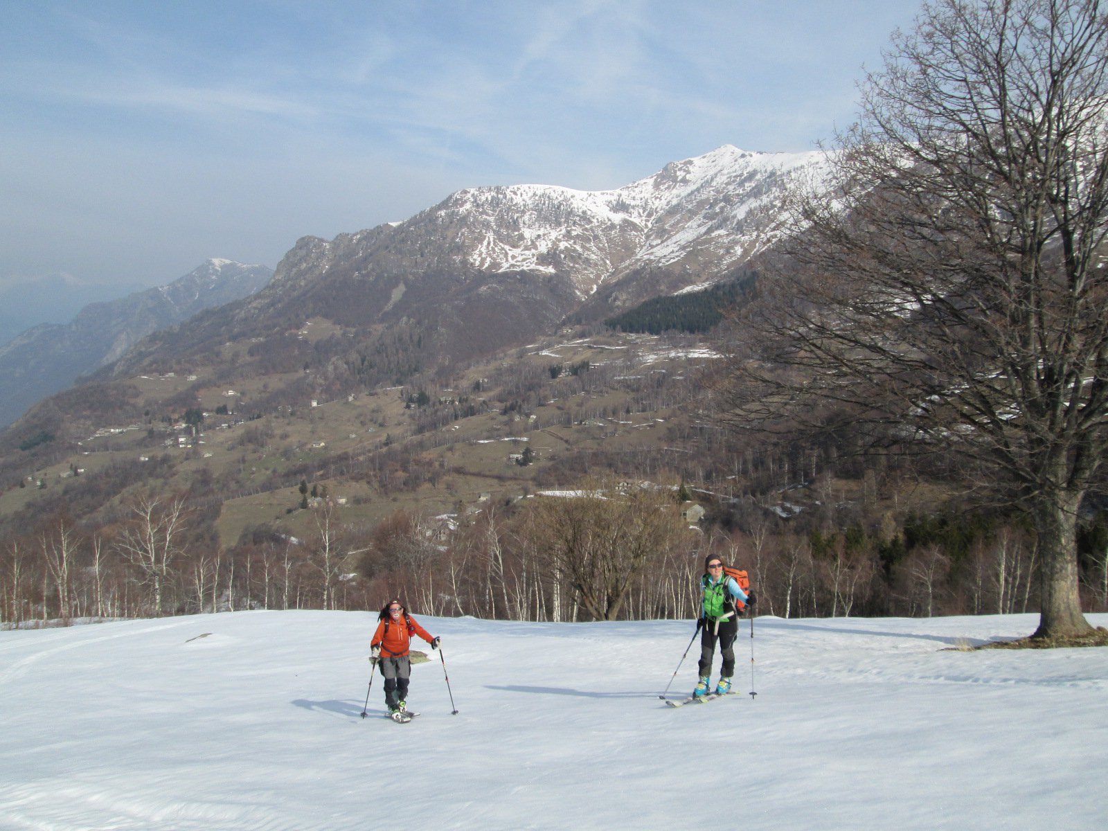 Dopo molta indecisione sulla meta abbiamo preso spunto dalla relazione incoraggiante di ieri, e quindi siamo venuti a ficcare il naso in questo vallone che era una novità quasi per tutti. La neve comincia a quota 1.280 m circa, appena dopo il campeggio. Partenza sci ai piedi alle 8.40, con un buon rigelo notturno; a parte un breve passaggio di 2 metri l’innevamento è continuo dall’auto alla vetta. Nella parte bassa, a causa della boschina, per chi non conosce la zona è un po’ laborioso trovare la direzione corretta, poi dai 1.500 m si va su terreno aperto e tutto diventa più chiaro. Un po’ ravanoso il valloncello che inizia poco dopo l’Alpe Buri, ma si sale abbastanza bene. Da lì in poi le difficoltà finiscono e si sale comodamente sci ai piedi fino a 50 metri lineari dalla vetta, che si raggiunge in 2 minuti a piedi causa mancanza di neve. Discesa iniziata alle 12,15…bellissima neve primaverile, tanto che siamo scesi fino a quota 2.000 m circa e poi abbiamo deciso di ripellare e salire anche sul Cavalpiccolo.