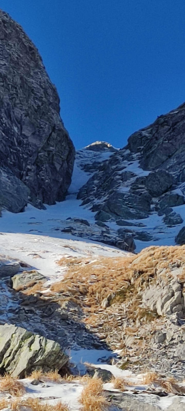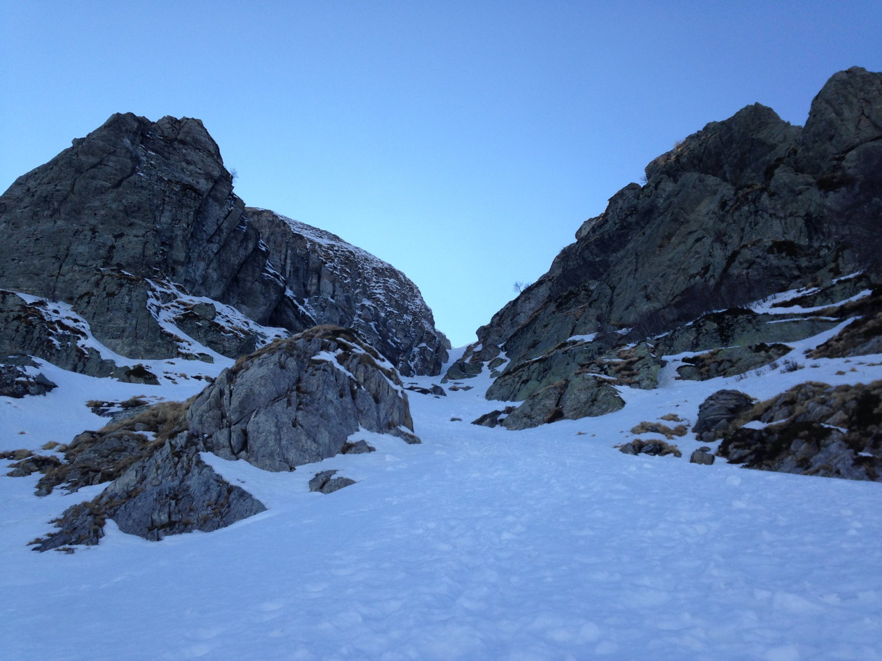 Giunti al passo, o poco prima se si proviene dalla strada di cava da Gorfigliano, si costeggia a NO del passo il versante nordorientale del M. Cavallo, fino a reperire l’evidente canale di salita, ampio in basso e più incassato sopra (il canale è comunque il primo che si incontra partendo dalla Focolaccia; poco più avanti si trova il più impegnativo canale Ceragioli).
