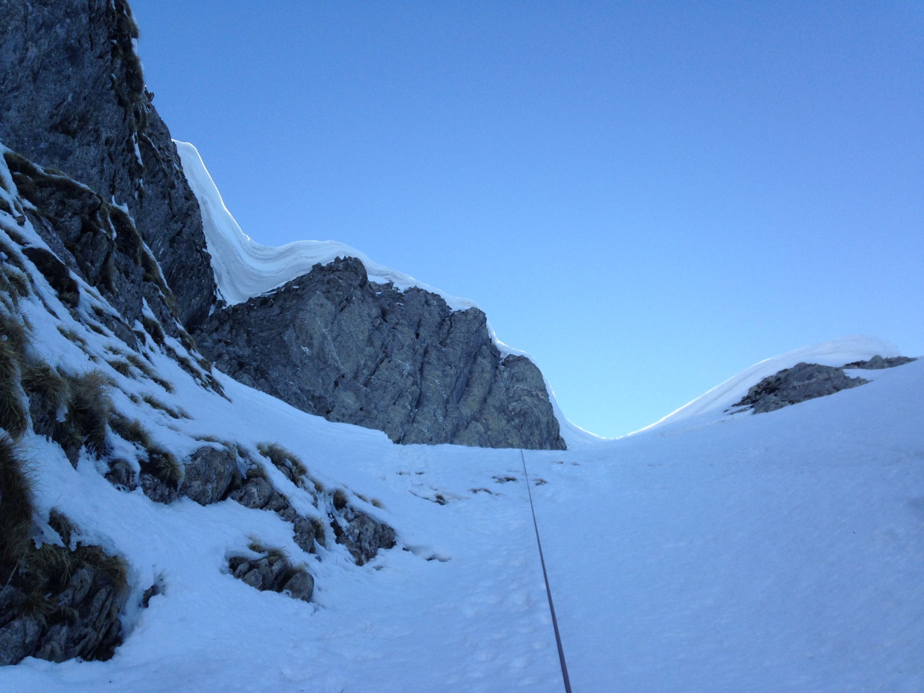 Si sale lungo il canale, che ha un dislivello sui 200 m, con pendenze attorno ai 30-40° sui pendii iniziali, fino all’uscita sui 55°, spesso sovrastata da imponenti cornici. Sulle rocce a sx salendo si trovano svariate soste per assicurazione o calata (spesso con vecchi chiodi e cordini, da controllare). Il canale sbuca fra la quota massima del M. Cavallo (1895 m) e la quota più settentrionale (1889 m); quest’ultima è raggiungibile abbastanza facilmente seguendo a dx la cresta sommitale.