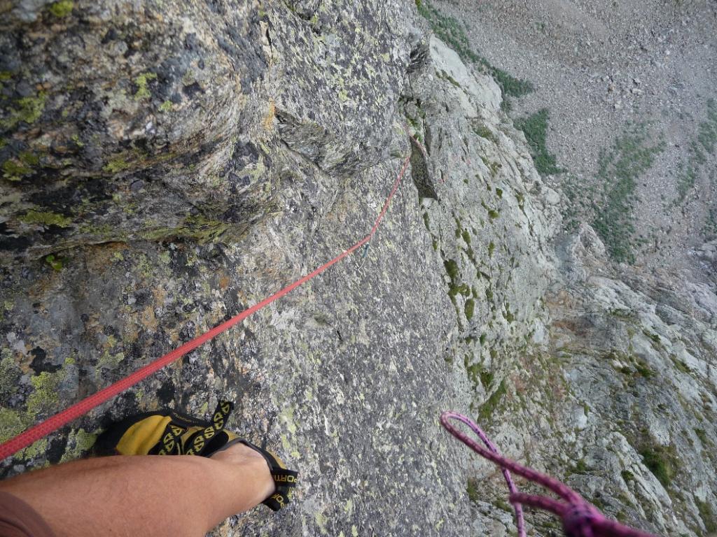 L9, 40 m, 5a, 4 fix: direttamente per il filo del pilastro soprastante, roccia a tratti instabile e molto lichenata.