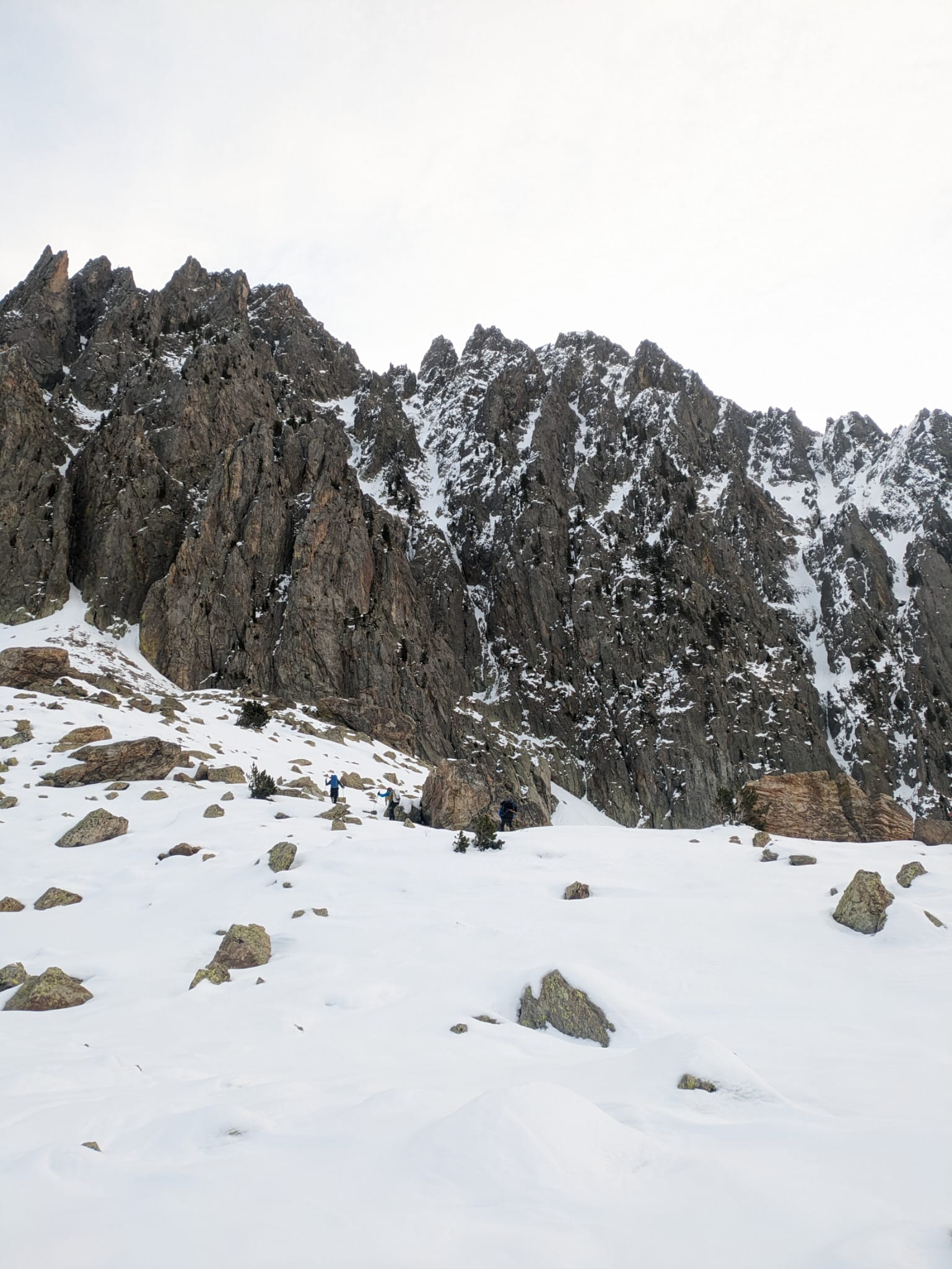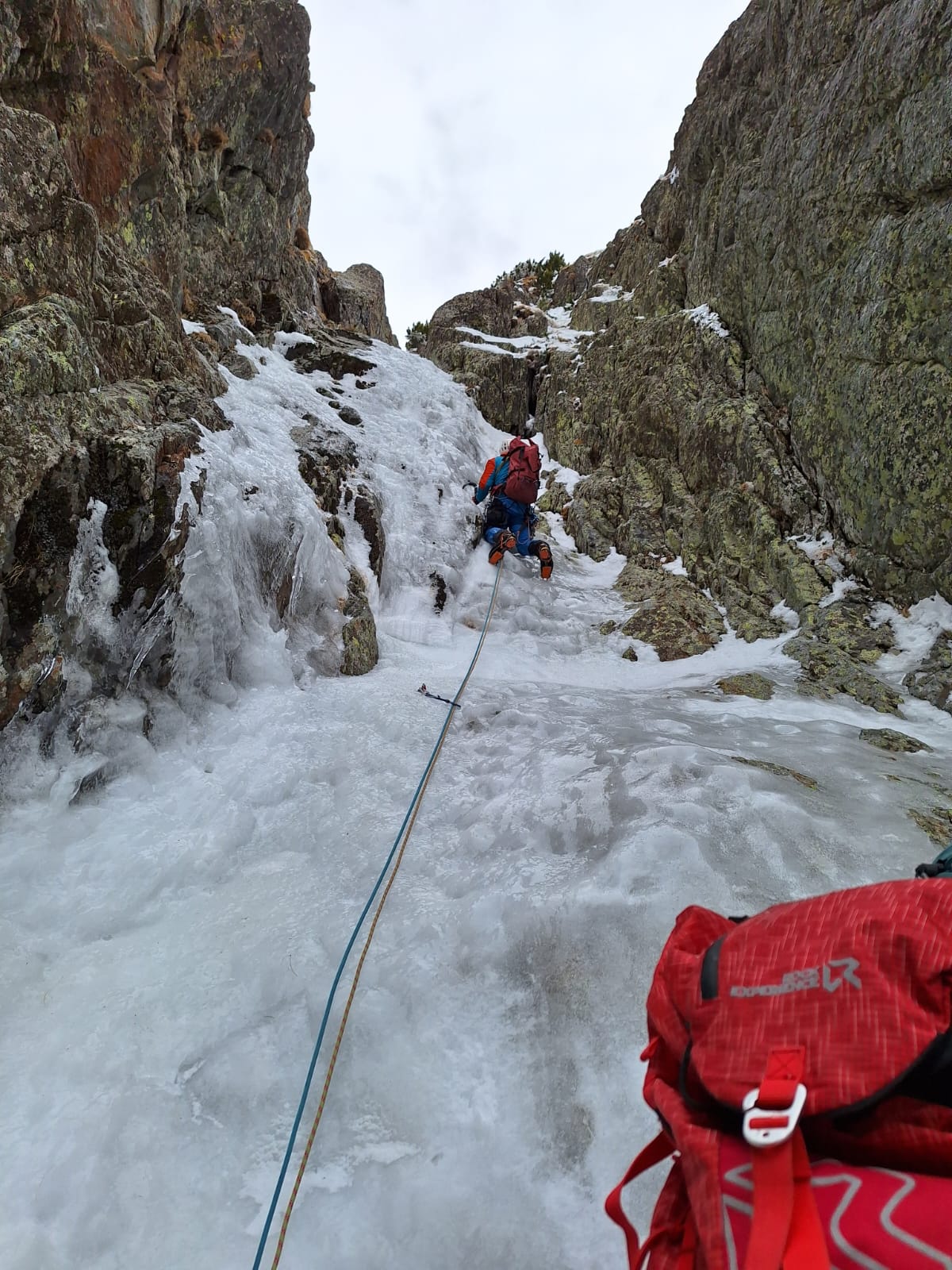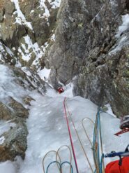 - L1 40 m Si risale una specie di camino con 2 cenge di ghiaccio fino ad un pendio di neve sotto un’altra cengia. In buone condizioni, possibile la sosta su pino. Altrimenti, poco sopra.