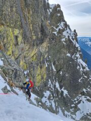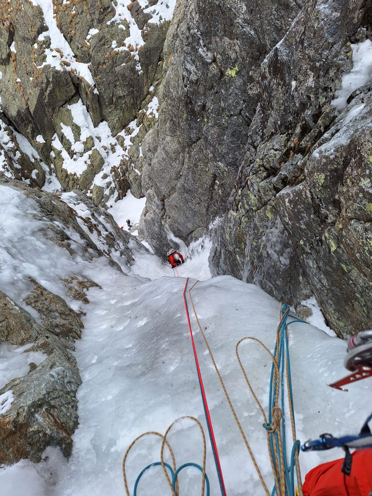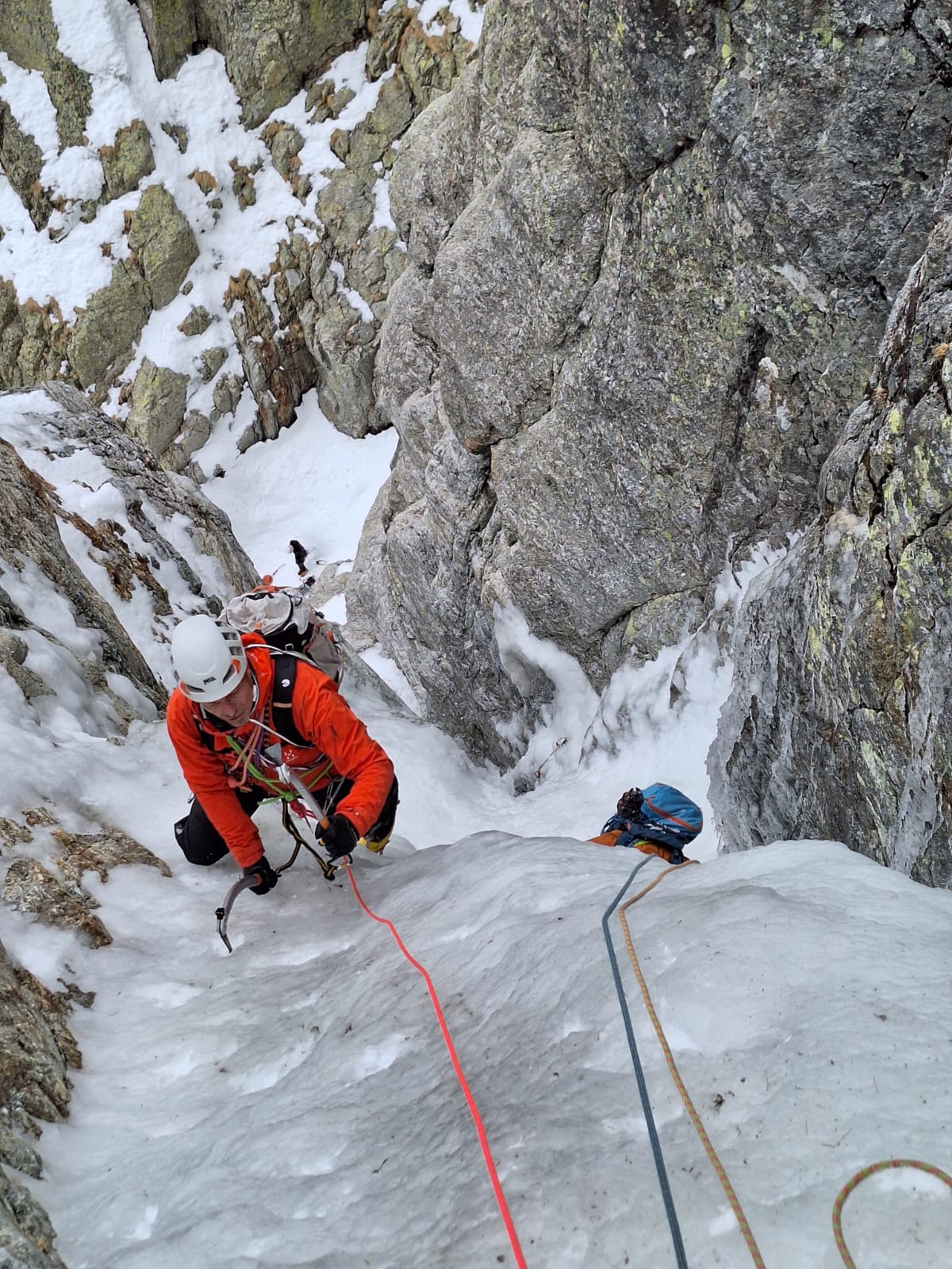 L3 M5 45 m Lunghezza molto bella, primo passaggio leggermente strapiombante poi qualche risalto. - Poi neve mista meno sostenuta fino all’ultimo tratto di misto M4/M5 ripido ma ben protetto a seconda dell’uscita scelta e delle condizioni.