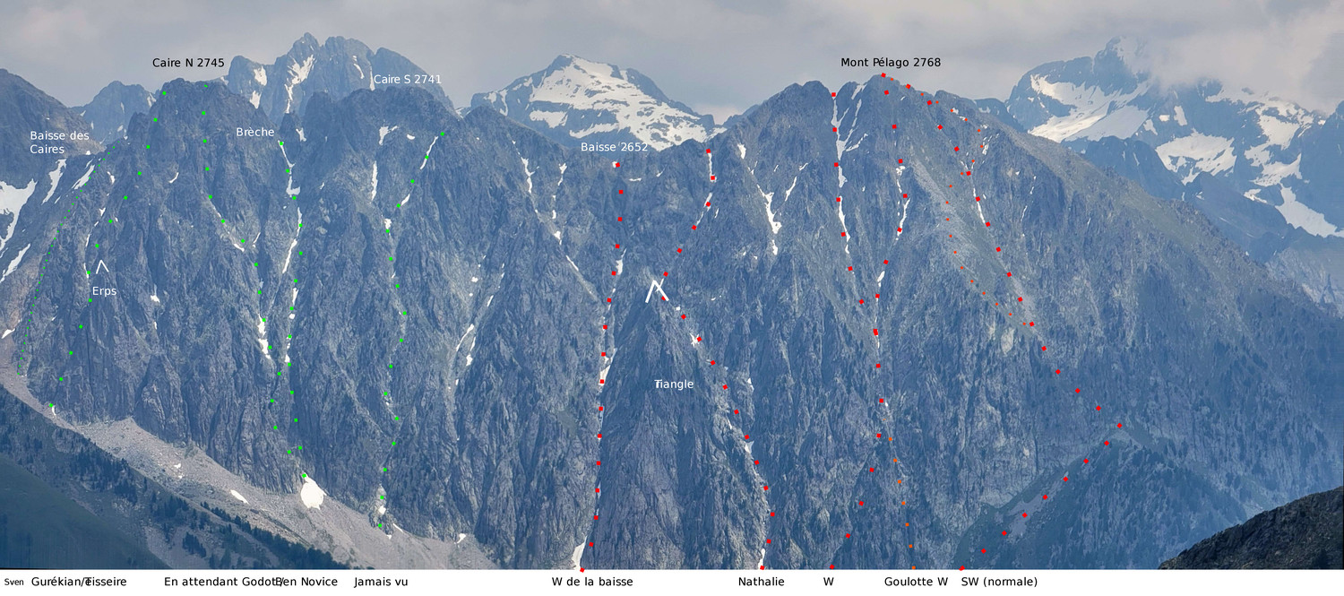 Facile discesa sul versante O fino a una calata in corda doppia di 40 m su un becco sulla mano sinistra (cordino in posizione) per raggiungere un colletto nevoso sullo sperone che costeggia la sponda destra. Pochi metri più in basso, discesa in doppia attrezzata con chiodi a pressione sul versante N per superare una rampa mista e raggiungere un canale con pendenza di 35/40° che scende direttamente nel vallone dell’Erps.