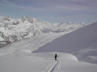 In discesa neve splendida, ma poco sciabile vista l’abbondanza: in ogni caso sapevamo che poco sotto la vetta avremmo potuto sfruttare il lavoro di battitura (oggi provvidenziale) delle piste dell’Alpe Devero.