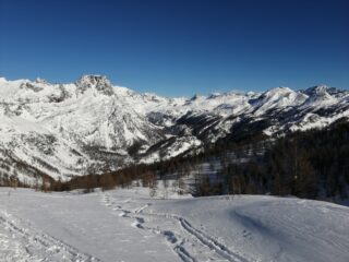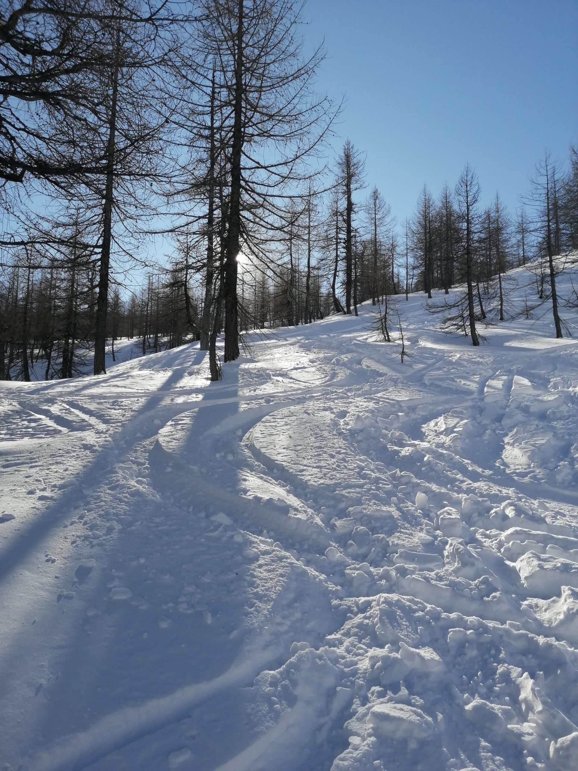 Alla ricerca della neve fresca, ottima domenica all’Alpe Devero insolitamente poco affollata per via degli impianti chiusi. Salita al monte Cazzola passando dall’alpe Misanco con ripellata nella valletta sopra l’alpe. Cima quasi erbosa per via del lavoro del vento. 20 30 cm di neve fresca ancora non troppo pesante. Temperatura frizzante in ombra e gradevole al sole, vento solo in vetta a tratti. Bella discesa sulle piste non battute ma un po’ tritate dai passaggi. Con Alberto e Luigi. Giornata spaziale.