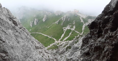 Seguire l’evidente traccia fino ad una sella e calarsi con una doppia da 40 metri fino alla forcella d’attacco della Normale al Torrione Cecilia.