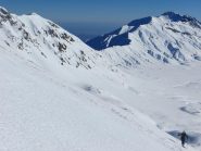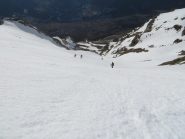Discesa:dalla vetta si scende per il canale di salita fino a quando questo si allarga in un bel pendio concavo dalla pendenza meno accentuata.Si continua a scendere fin quando il pendio tende a stringersi.Da questo punto si obliqua verso dx e ,superata una crestina minore,se ne scavalca anche una seconda per entrare in un altro canale che permette di scendere senza problemi fino al bosco di Macchia Grande (circa 1500 m.)Tolti gli sci,uscire verso sx e salire sul dosso per prendere il sentiero lungo il dosso che arriva nei pressi dell’inizio della S.P. del Vasto.Da qui alla stazione inferiore della Funivia.