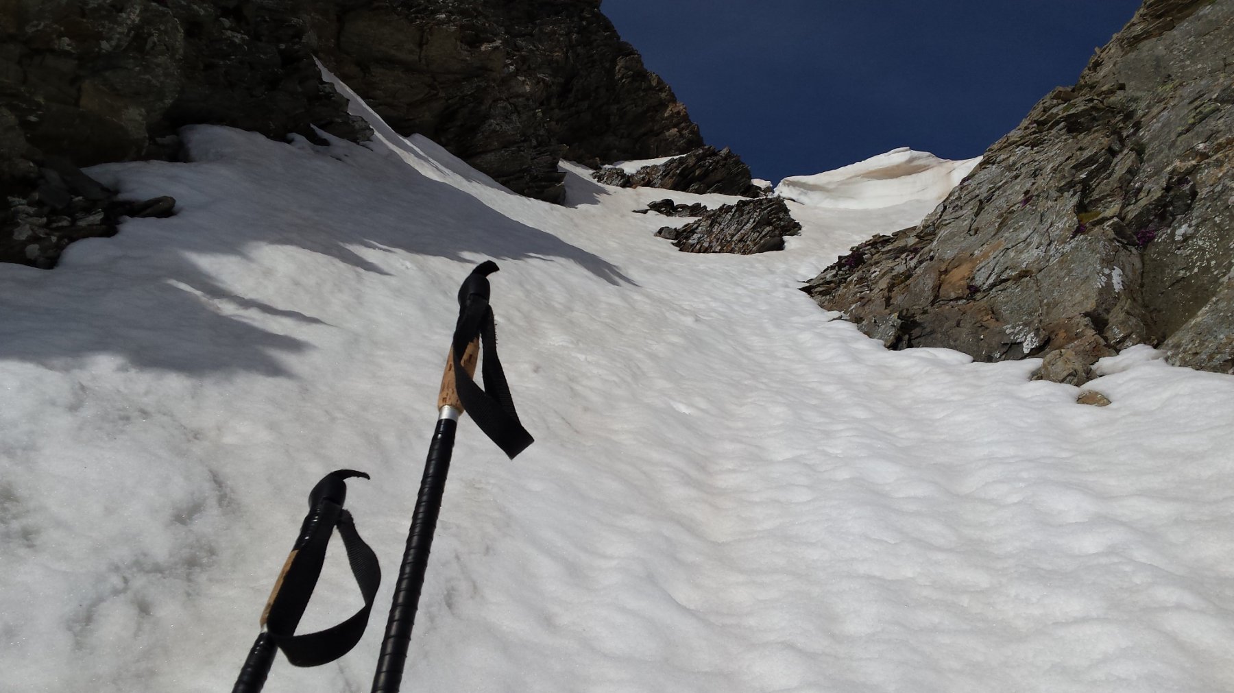 Al mattino il lato svizzero del colle era intabarrato nella nuvola con vento fastidioso. Cambio di programma cercando di inventare qlc su due piedi o, per meglio dire, su “due sci”. Si cammina ormai per un 20 minuti. La neve si sta sciogliendo a vista d’occhio. Neve non rigelata a dovere, soprattutto nel canale che ho seguito per sbucare sulla cresta. C’è una bella cornice, ma la si aggira abbastanza facilmente. Prime curve nel canale trigose: non so per quanto ancora si riusciranno ad aggirare gli spuntoni rocciosi con gli sci ai piedi.