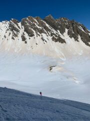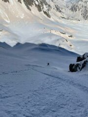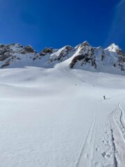 Giornata di sole perfetta per una gita su questo itinerario con un bel gruppo di amici. Partenza dal traforo del tunnel del Gran San Bernardo, siamo saliti sulla strada del Colle del Gran San Bernardo fino ai primi alpeggi e poi in direzione del Col Saint Rhemy dal quale si gode di una vista spettacolare su tutta la Crete des Ceingles con la sua singolare sagoma di pipistrello-vampiro e i suoi diversi canali. Siamo scesi per un centinaio di metri dal colle e abbiamo attraversato l’ampio e suggestivo pianoro che porta alla base dei canali. Abbiamo risalito con ramponi il canale svalangato “spalla del vampiro” che presentava più facile accesso alla cresta raggiungendo l’uscita e poi in cresta fino alla vetta. Per la discesa il gruppo si è diviso in tre dei diversi canali intonsi tra cui quello di salita. In 4 abbiamo scelto il canale “mantello del vampiro” vicino a quello di salita: ingresso con piccola cresta da saltare, prime tre curve un po’ crostose e poi neve da urlo polverosa fino alla fine del pianoro sottostante. Breve risalita a piedi di 20 metri per raggiungere nuovamente il Col Saint Rhemy e poi discesa fino all’auto su neve morbida e ben sciabile