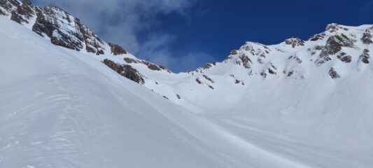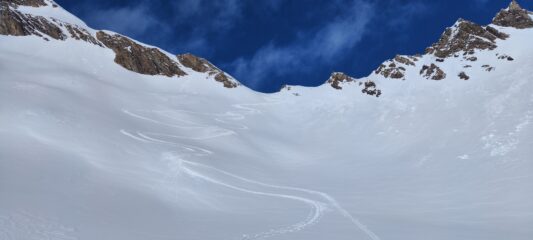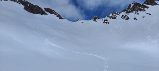 Oggi volevo evitare luoghi troppo frequentati così ho scelto questa gita …ma non non l’ ho indovinata purtroppo. In effetti ho battuto completamente la traccia e ho incontrato solo una persona in prossimità del colle che proveniva dal lato opposto. Mi ha detto che una volta sceso avrebbe poi risalito il Crevacol per tornare alla macchina! Io invece sono solo sceso…ho trovato neve bella soltanto nei primi pendii immensamente sotto al colle poi neve difficile e faticosa da sciare . Qualche curva poi in fondo dove aveva mollato completamente.