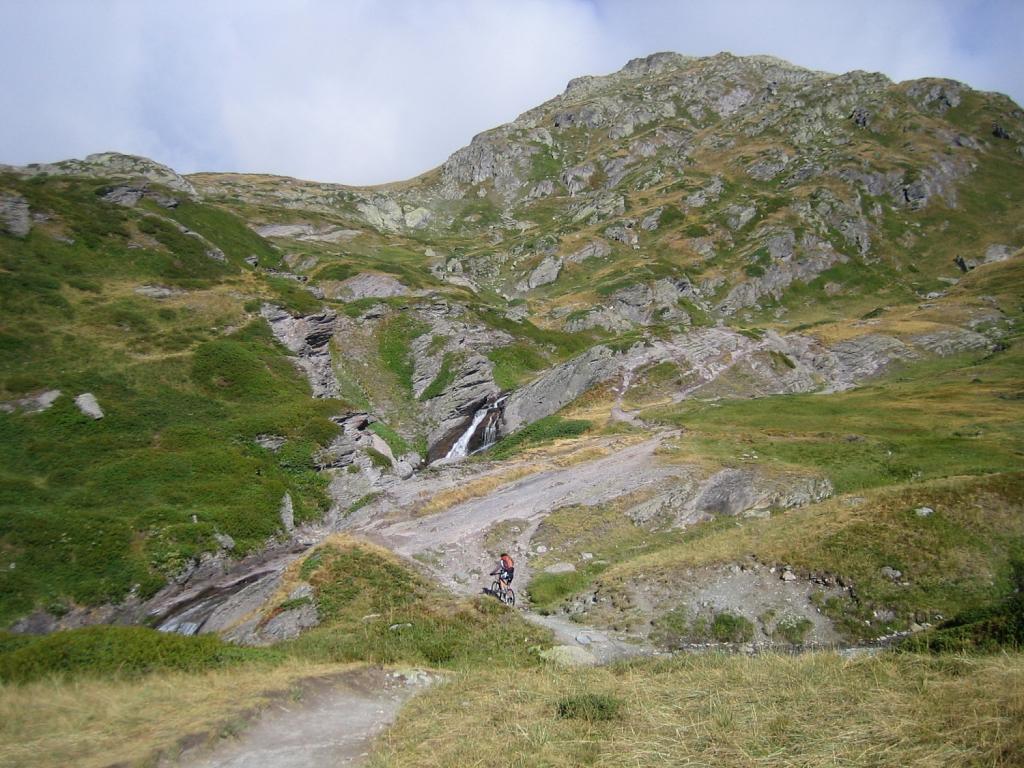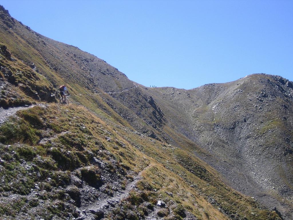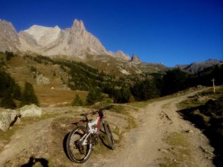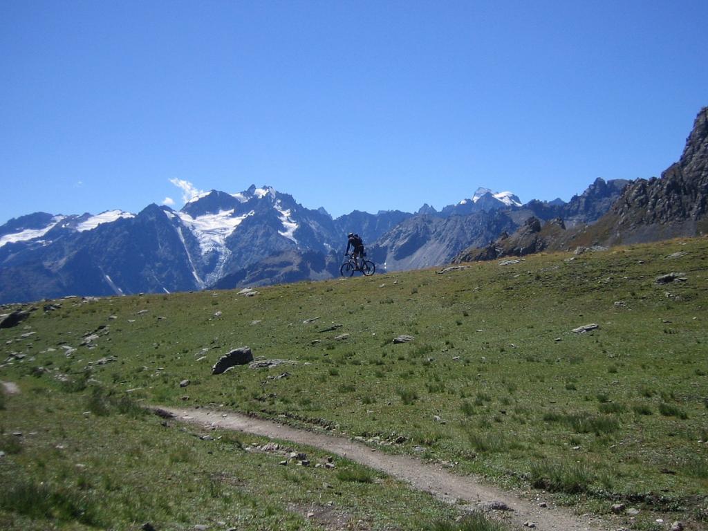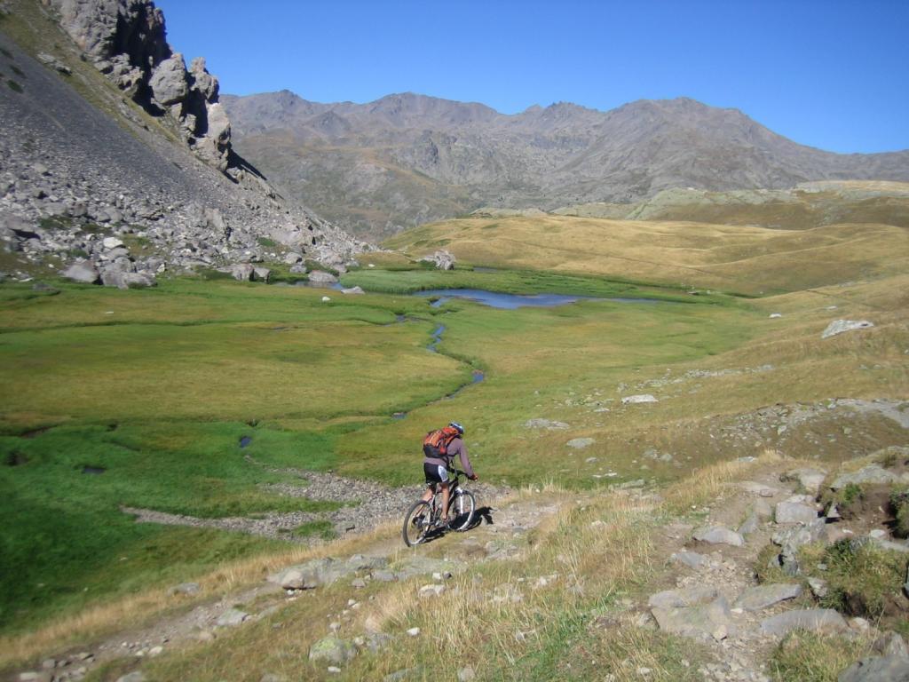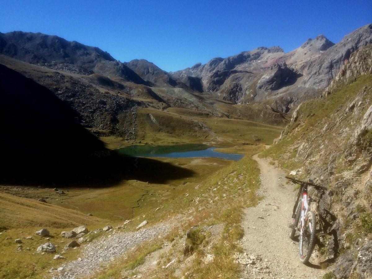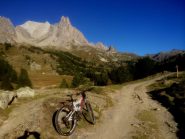 Raggiunto il bivio a quota 2209m proseguire in discesa fino a l’alpe de Lauzet (1940) da cui si riprende a salire lungo il sentiro balcone GR 50, anche detto ch. du Roy. Ciclabilità ottima fino sotto al colle quotato IGN 2340m, che si raggiunge in parte portando la bici.
