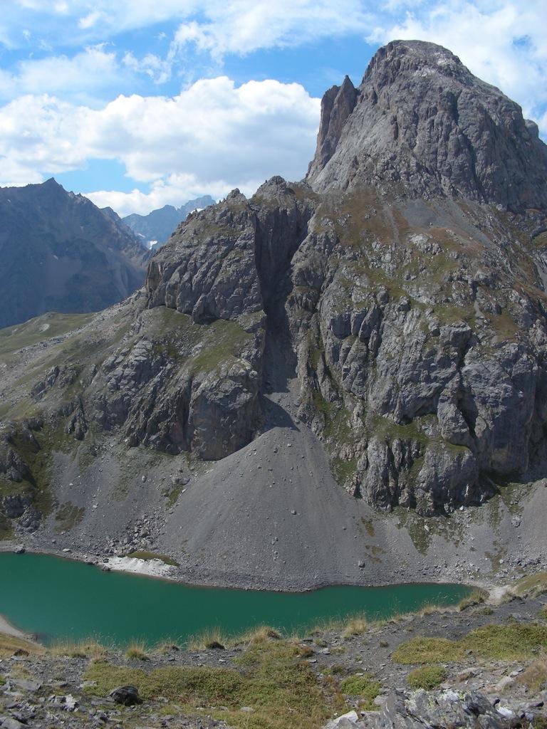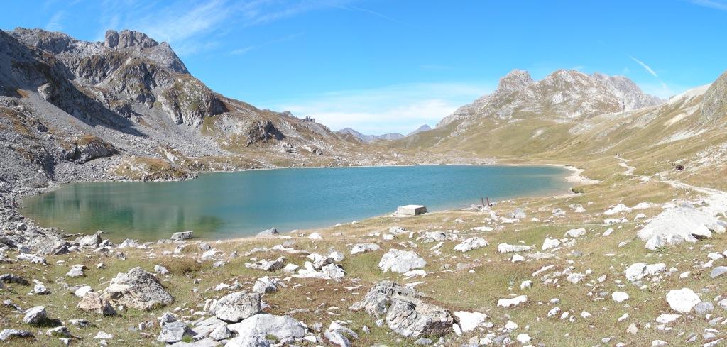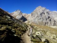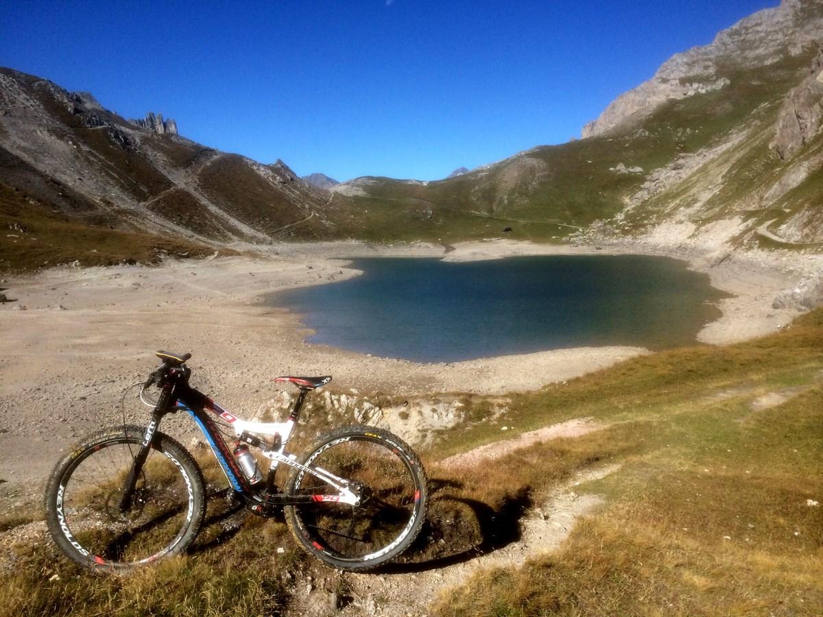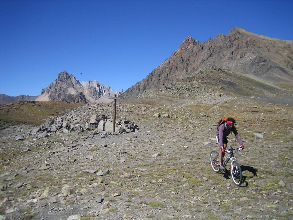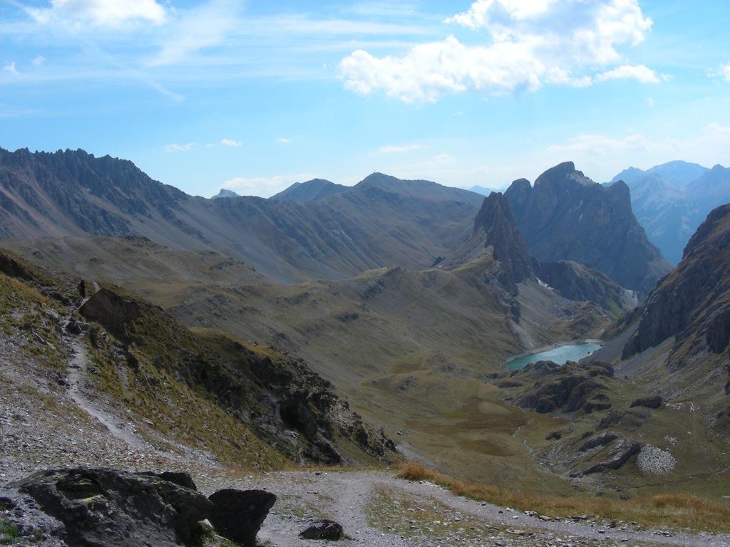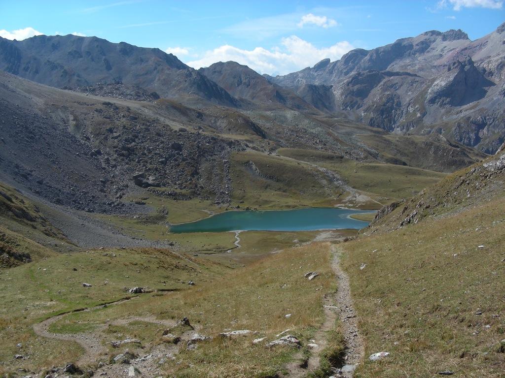 Raggiunto il bivio a quota 2209m proseguire in discesa fino a l’alpe de Lauzet (1940) da cui si riprende a salire lungo il sentiro balcone GR 50, anche detto ch. du Roy. Ciclabilità ottima fino sotto al colle quotato IGN 2340m, che si raggiunge in parte portando la bici.