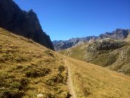 Oltre il colle si prosegue in discesa sempre sul sentiero balcone fino ad incontrare una carrareccia. La si risale, pendenze notevoli, fino ad incontrare un bivio (2320) da cui si diparte il sentiero, poco ciclabile, per il col de Buffere (2427).