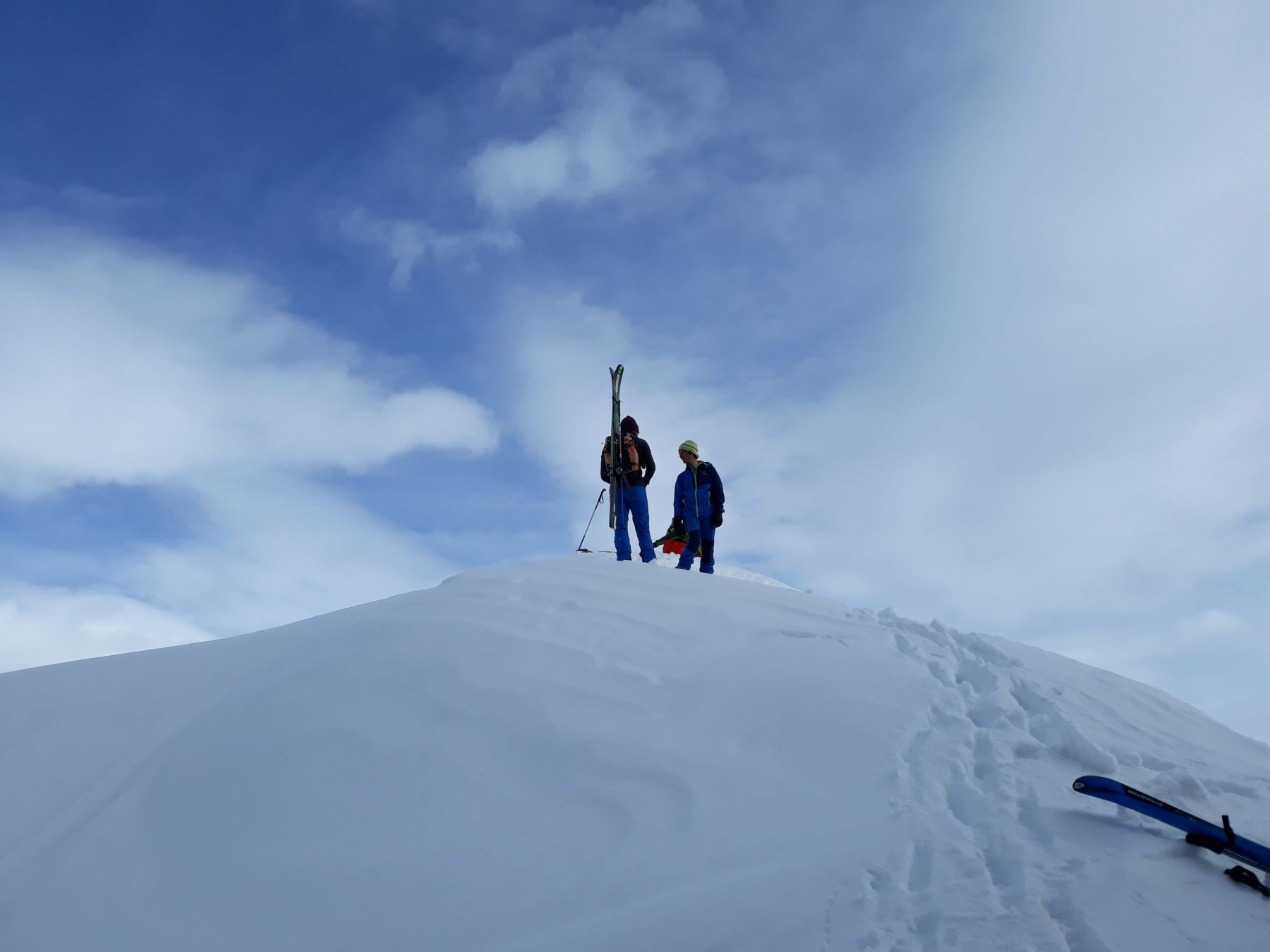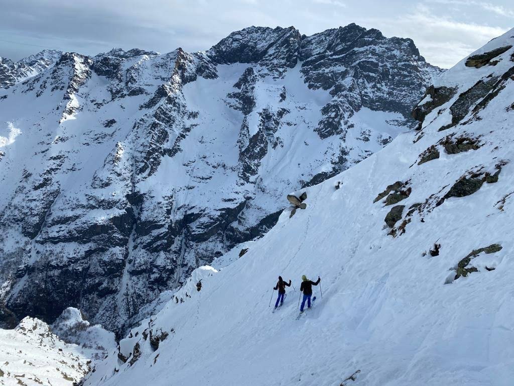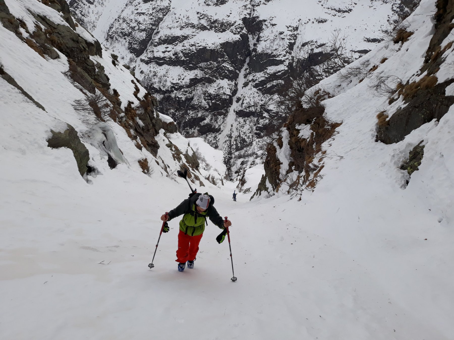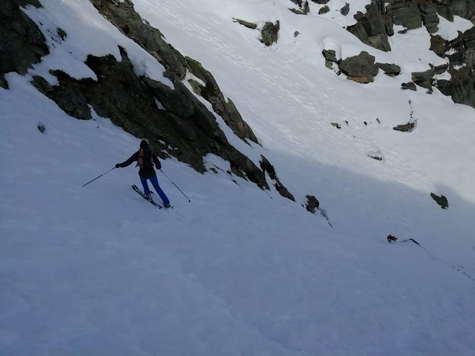 Se non troppo svalangato è possibile poi seguirlo in discesa arrivando a monte della casetta dell’acquedotto. Proseguire sul ripido pendio disseminato di piccole piante fino a sbucare all’antico Gias Mombran (1889m). Da qui il canale si vede molto bene, ripido ed incassato sulla destra. Davanti si apre invece il largo canalone detto “Dei Cacciatori” che mena alla sella omonima.
