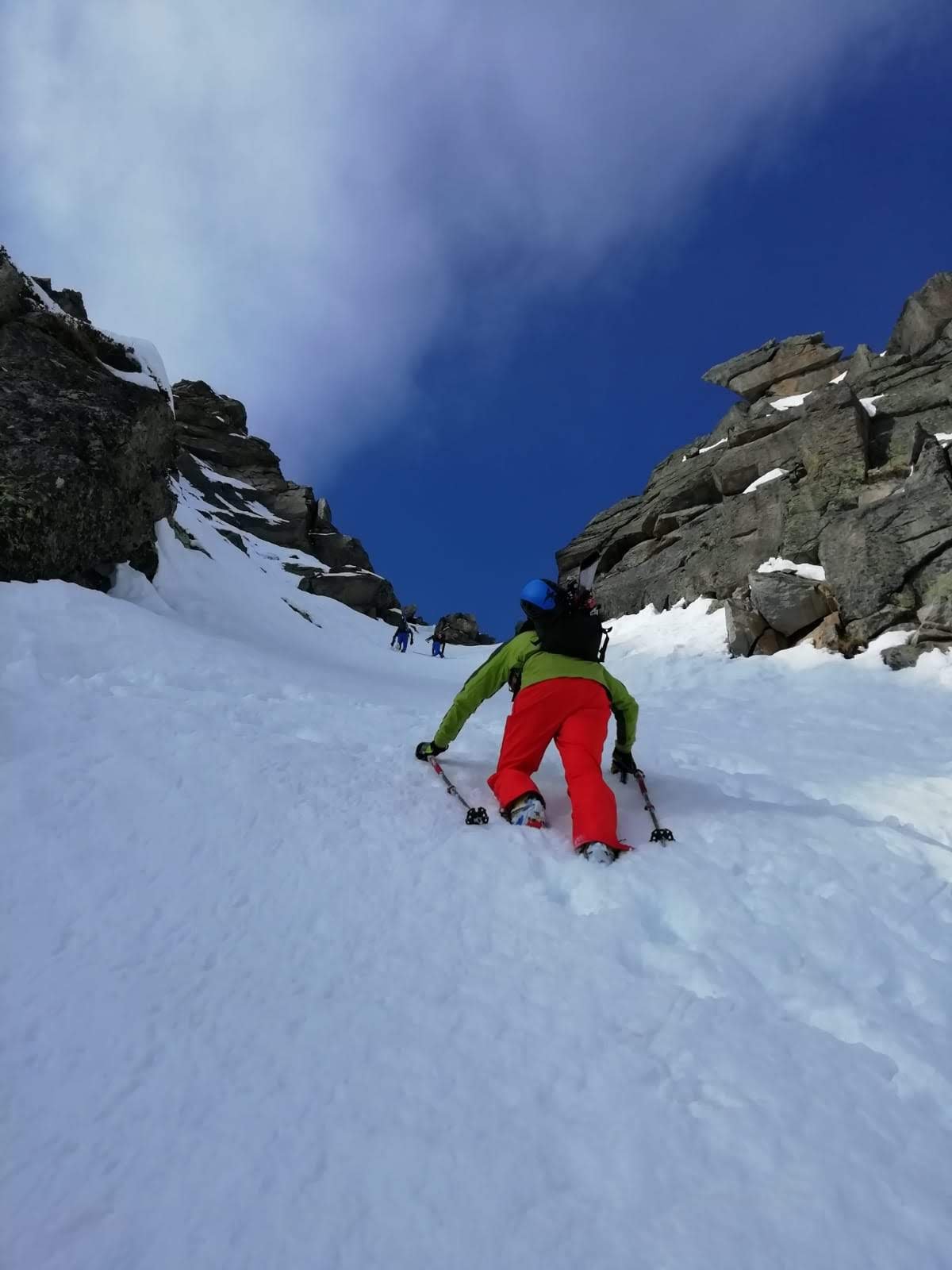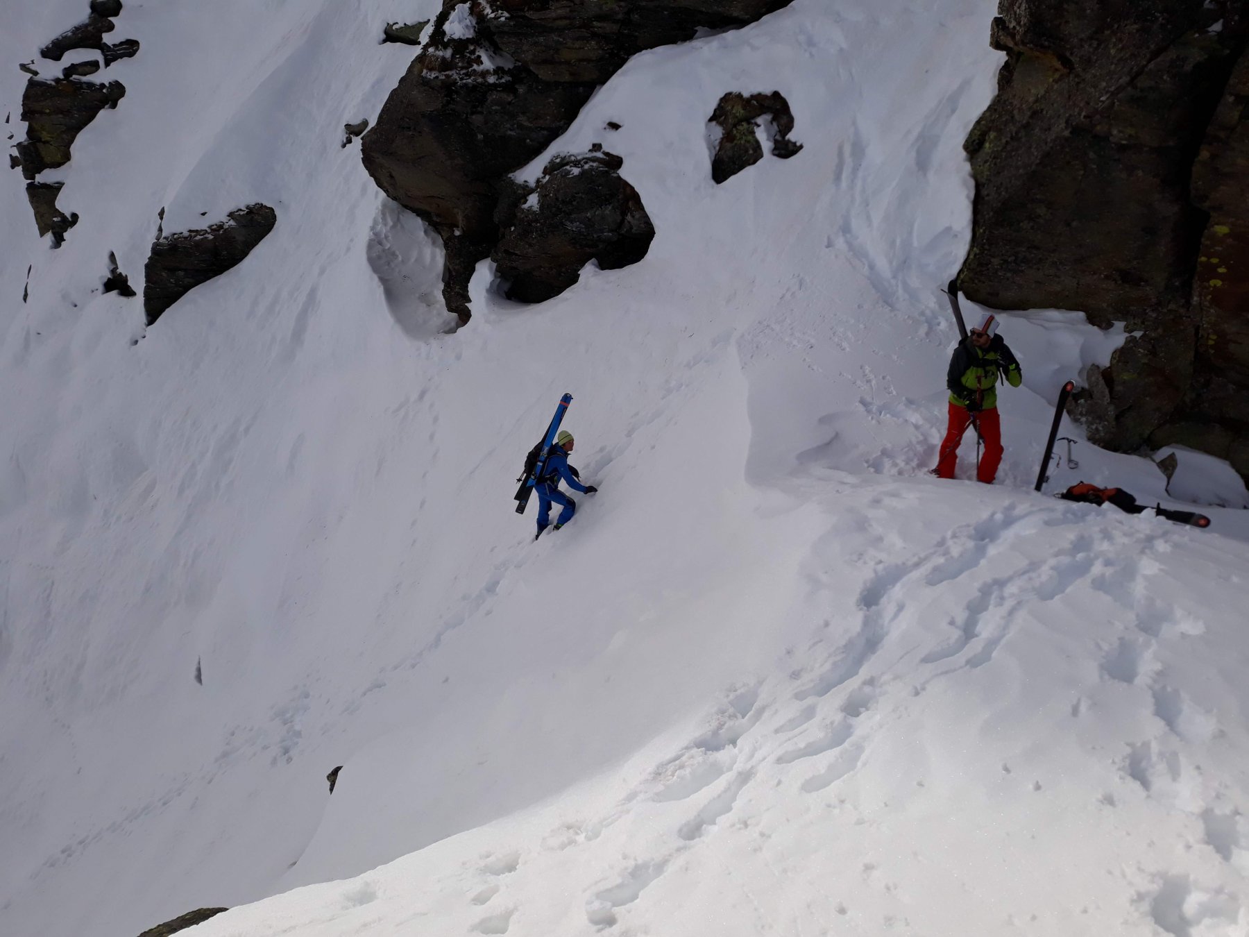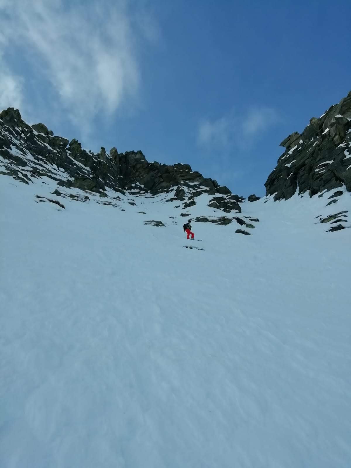 Portarsi facilmente alla base del canale e risalirlo fino alla sella (2500m circa). Detto canale misura esattamente 600m. Dopo una prima parte moderatamente ripida si supera una strettoia che da accesso a una seconda parte man mano più ripida fino a uno stretto corridoio. Al termine di questo si piega a sinistra e su terreno sempre ripido ed esposto si giunge alla comoda e panoramica sella.
