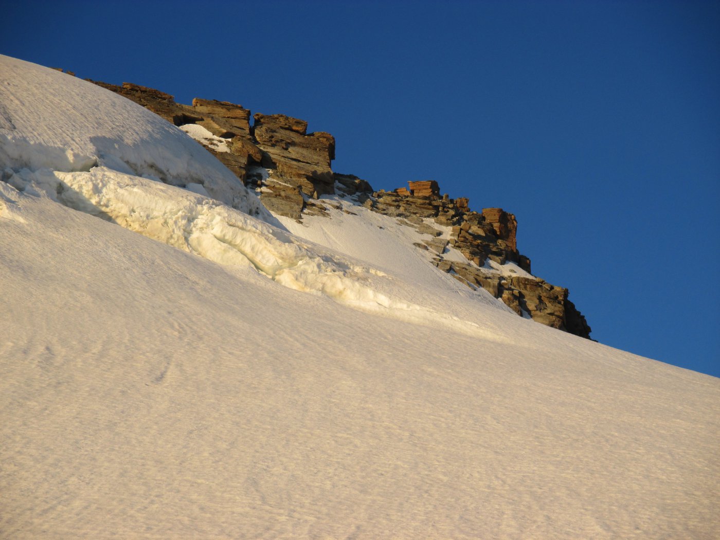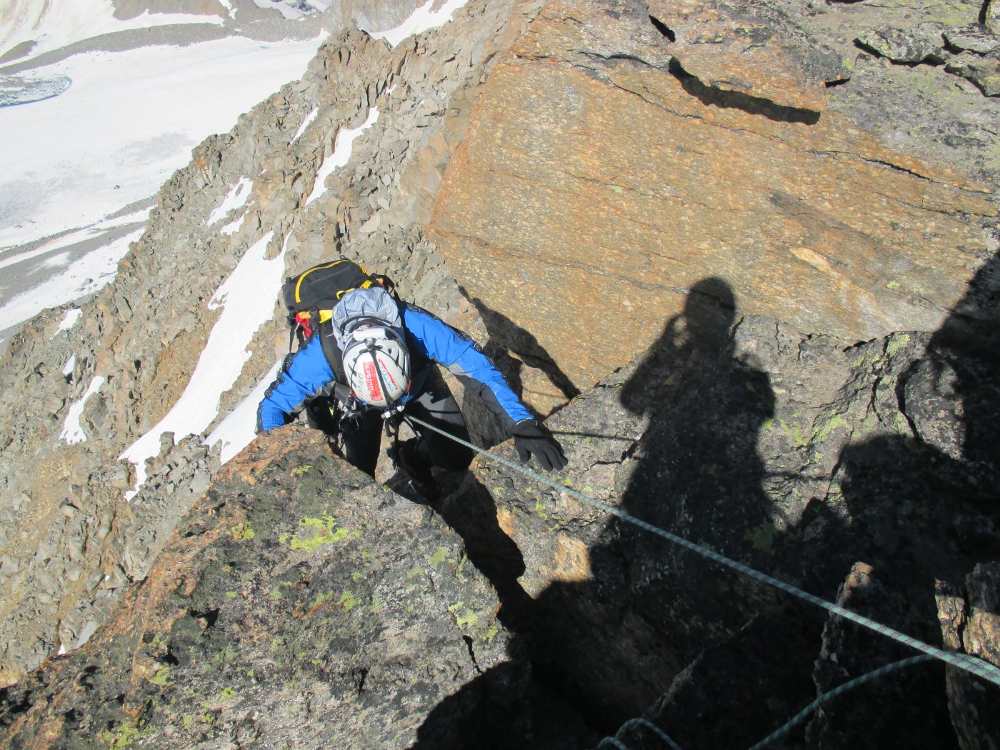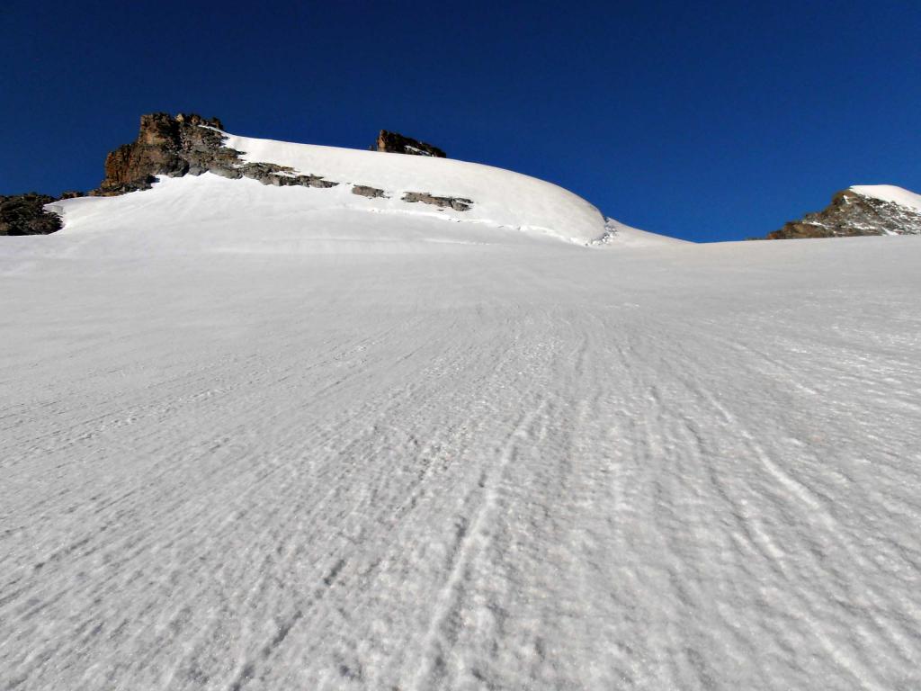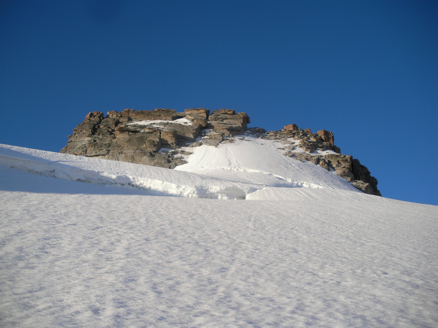 Arrivati al colle puntare verso le rocce della cresta ovest e risalire un canale di 30 metri a 35°. Salire quindi sulla parete sud tra blocchi accatastati solidi, raggiungendo l’intaglio fra le due cime (poco prima raggiungere questo punto è possibile, risalendo un tratto roccioso un po’ ripido, toccare la cima ovest).