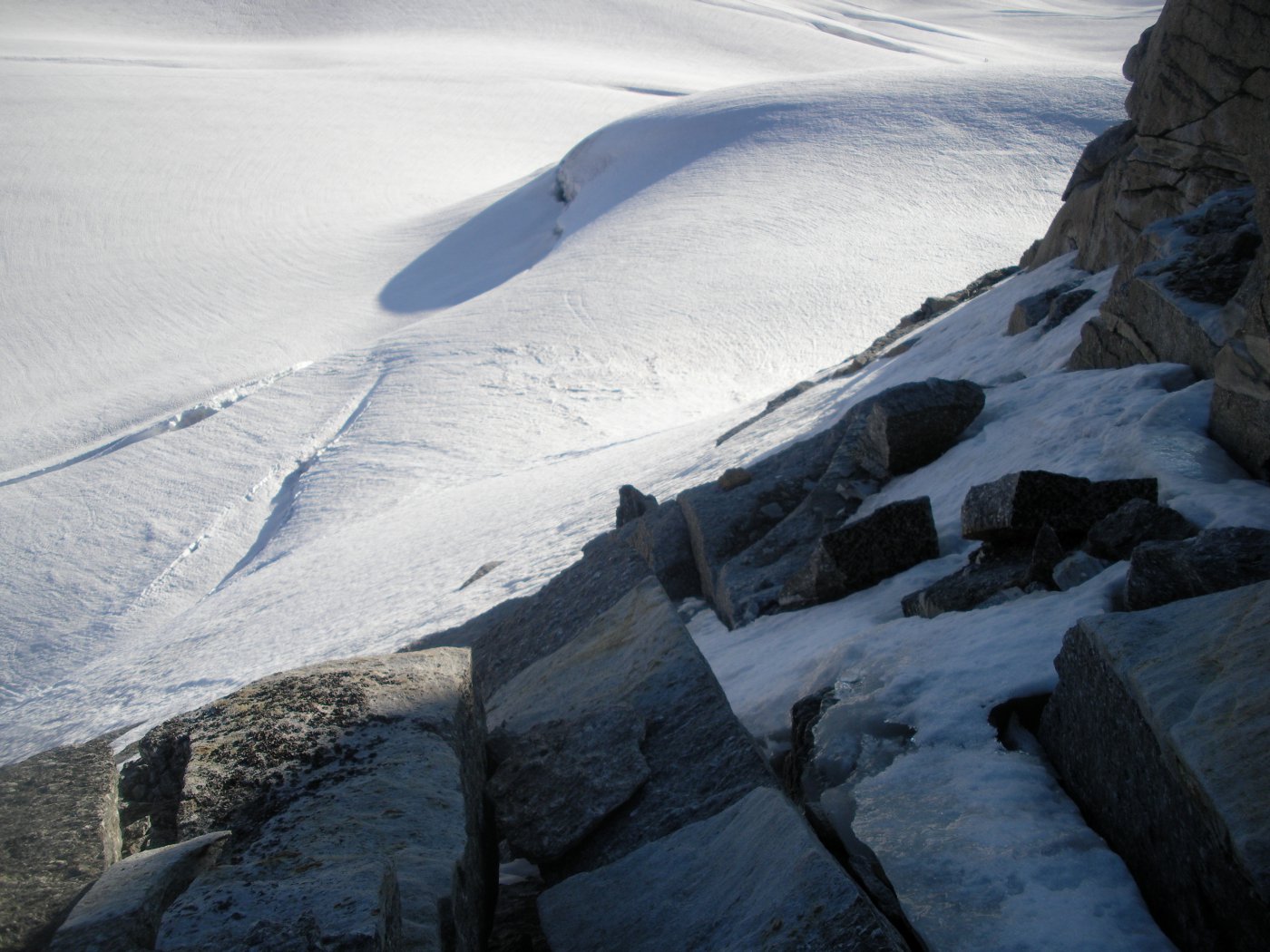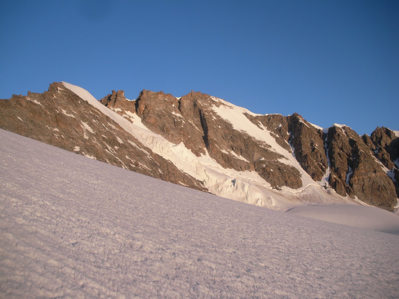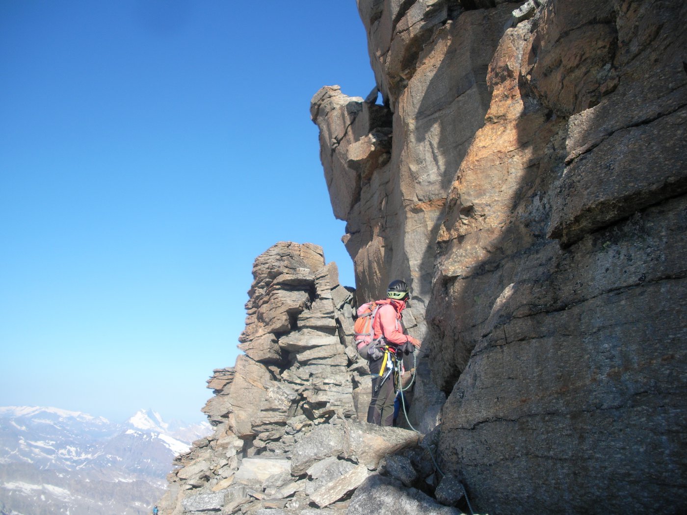 Arrivati al colle puntare verso le rocce della cresta ovest e risalire un canale di 30 metri a 35°. Salire quindi sulla parete sud tra blocchi accatastati solidi, raggiungendo l’intaglio fra le due cime (poco prima raggiungere questo punto è possibile, risalendo un tratto roccioso un po’ ripido, toccare la cima ovest).