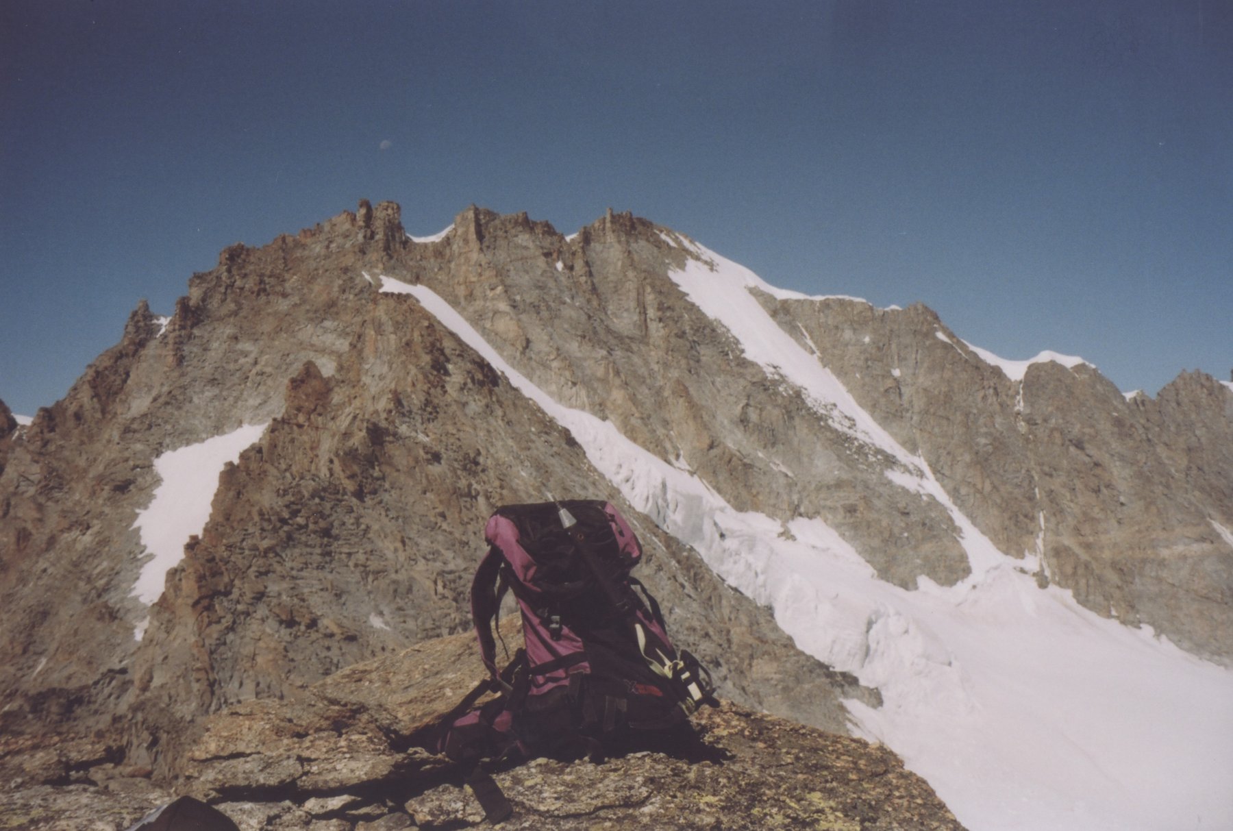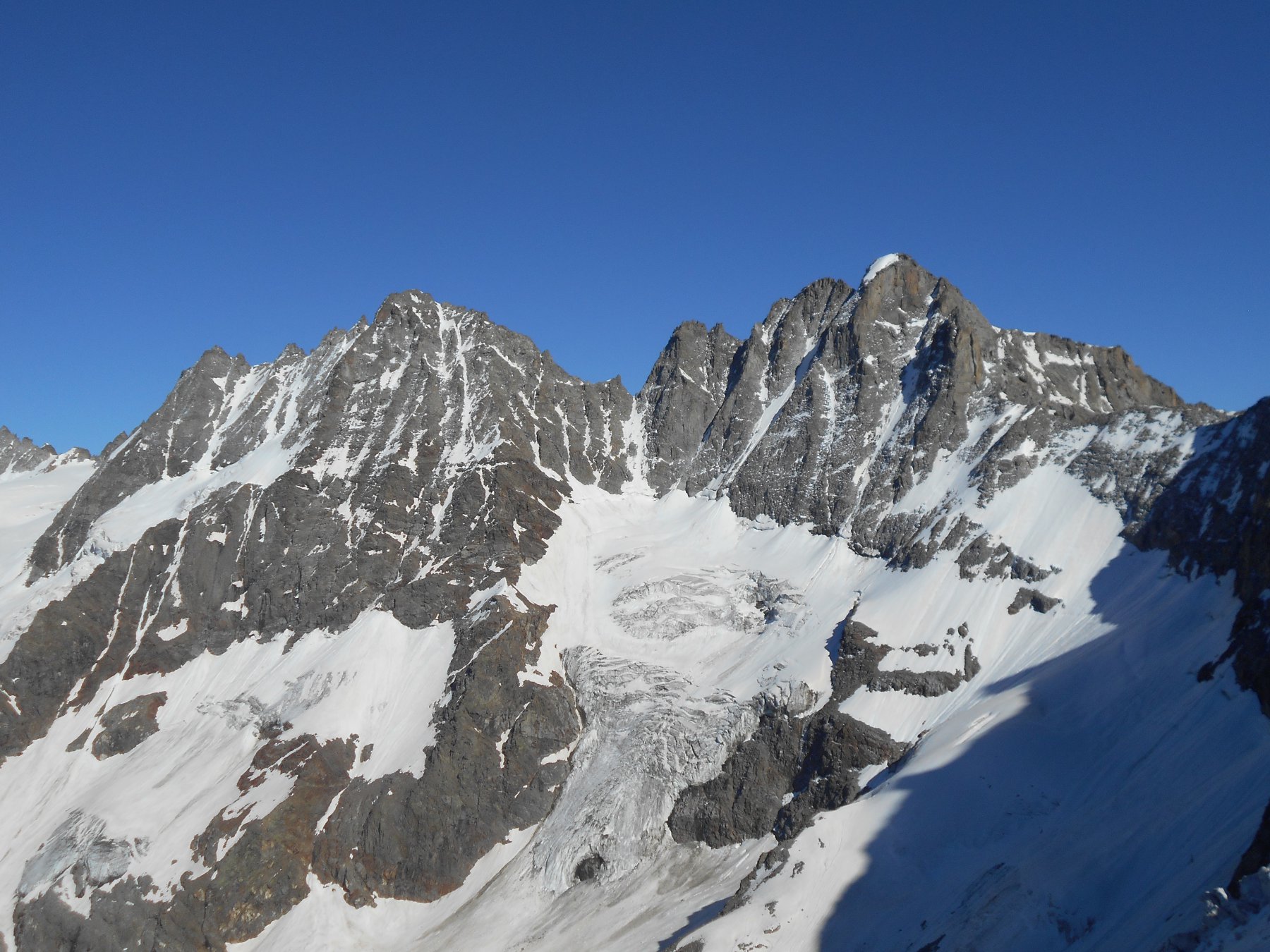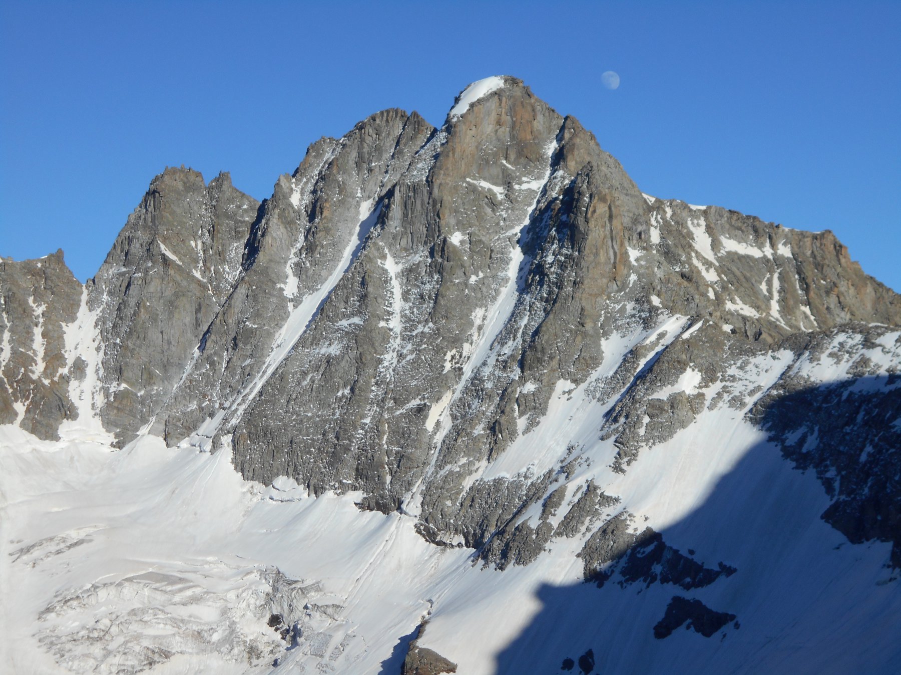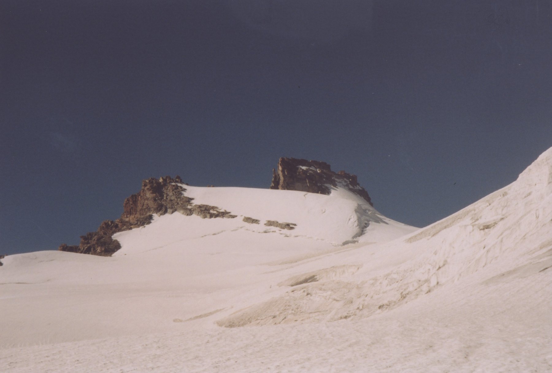 Arrivati al colle puntare verso le rocce della cresta ovest e risalire un canale di 30 metri a 35°. Salire quindi sulla parete sud tra blocchi accatastati solidi, raggiungendo l’intaglio fra le due cime (poco prima raggiungere questo punto è possibile, risalendo un tratto roccioso un po’ ripido, toccare la cima ovest).