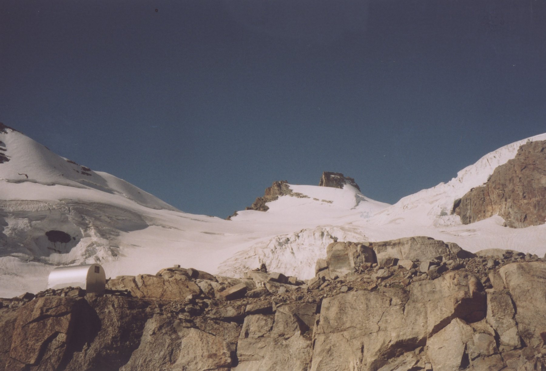 Dal colletto fra le due cime scendere di qualche metro e traversare verso est lungo il versante sud, costeggiando la cima est. Appena possibile risalire e raggiungere la cresta est, quindi tornare indietro verso ovest sul filo di cresta. Uno stretto intaglio poco prima della cima costringe a fare una doppia (cordone sul posto) di 5-6 m e a risalire. Sulla vetta si trova il classico triangolino del CAI di Rivarolo. Il tempo dal bivacco è di 2-3 ore.