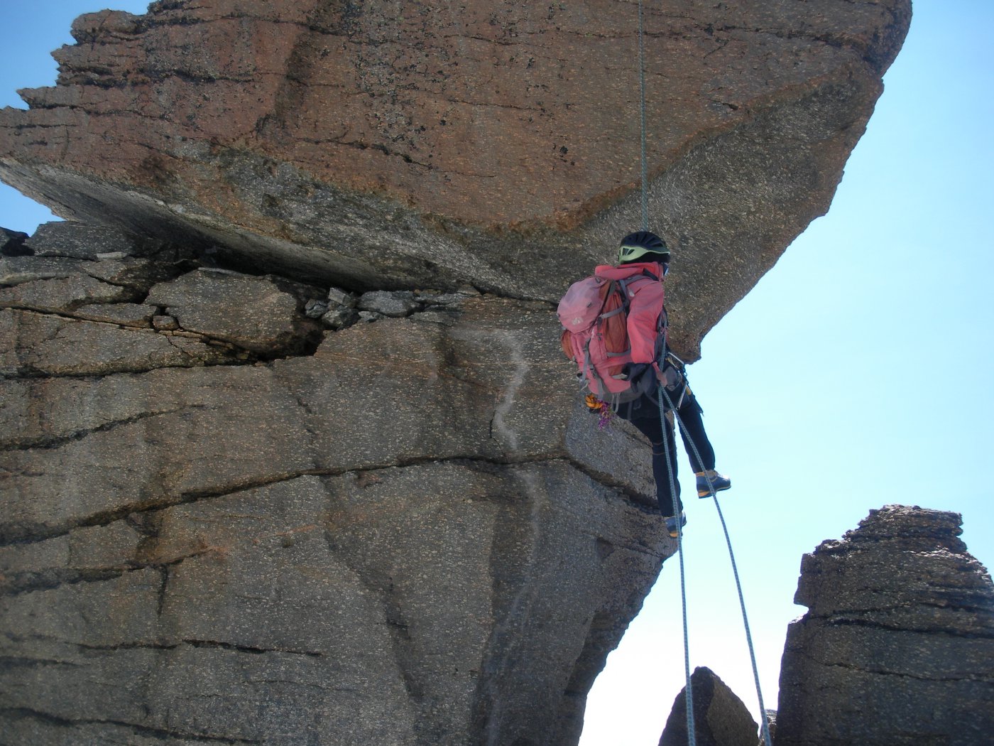 Discesa: dalla cima con una doppia di 10-12 m circa (cordone sul posto), nel vuoto gli ultimi metri, si scende direttamente verso ovest all’intaglio fra le due cime, da dove si ritrova il percorso dell’andata.