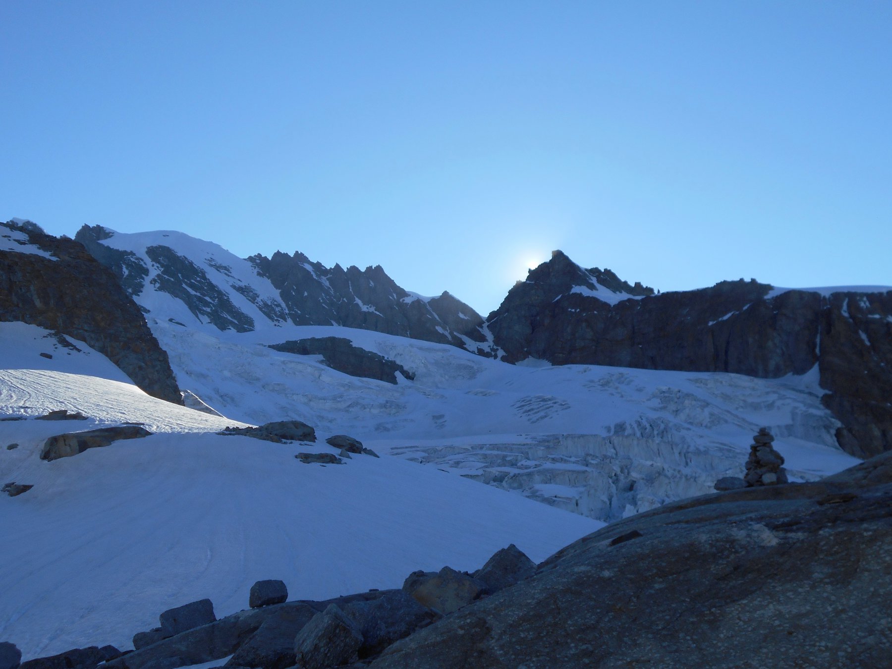 Attaccare il ghiacciaio della Tribolazione subito dal bivacco. Tenersi vicini (ma non troppo) allo sperone roccioso (sormontato da seracchi) e tagliare in obliquo verso sinistra e poi verso destra sotto la nord della Punta di Ceresole puntando al colle tra questa e il Gran Paradiso (Colle Chamonin).