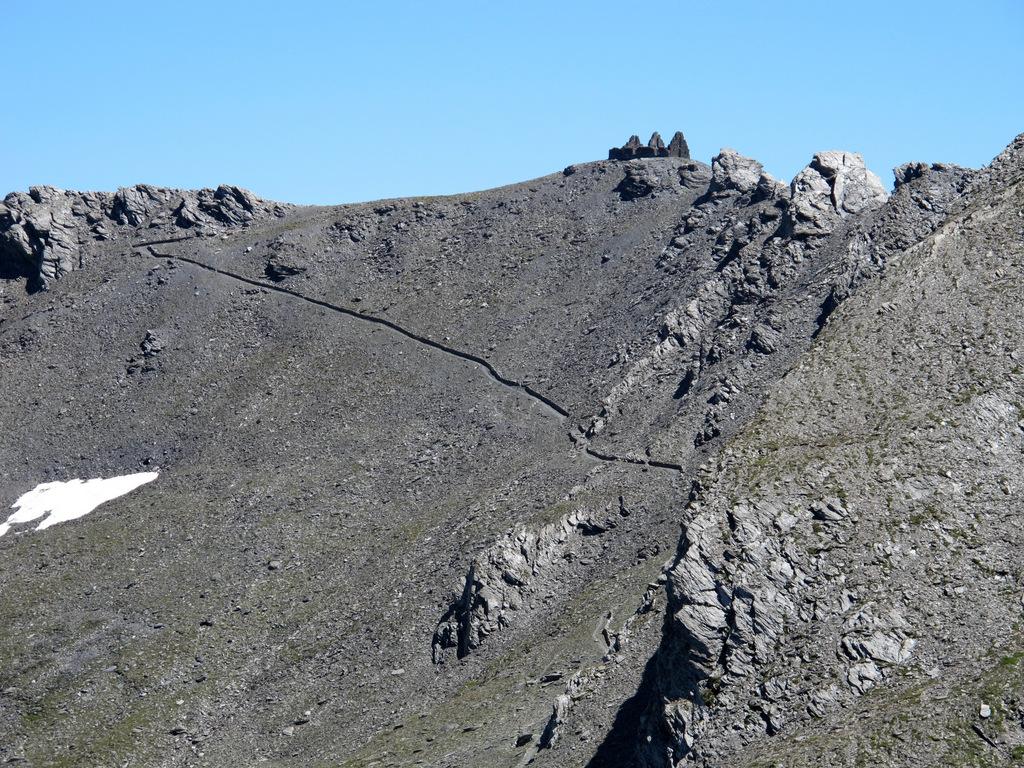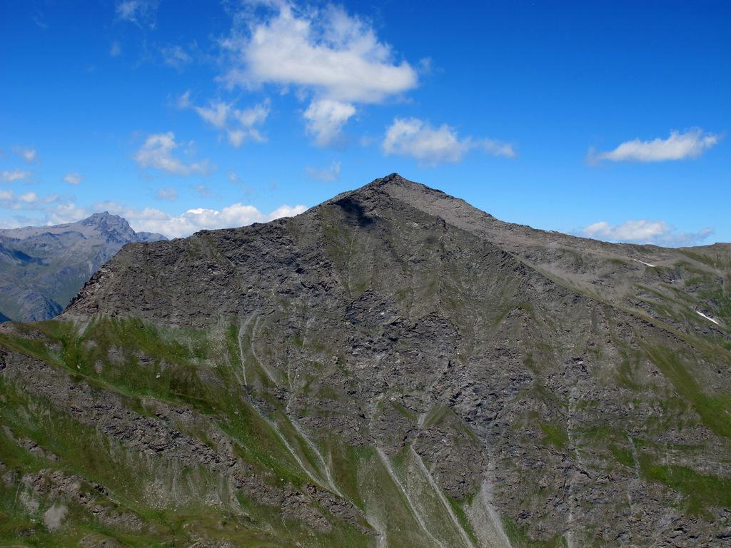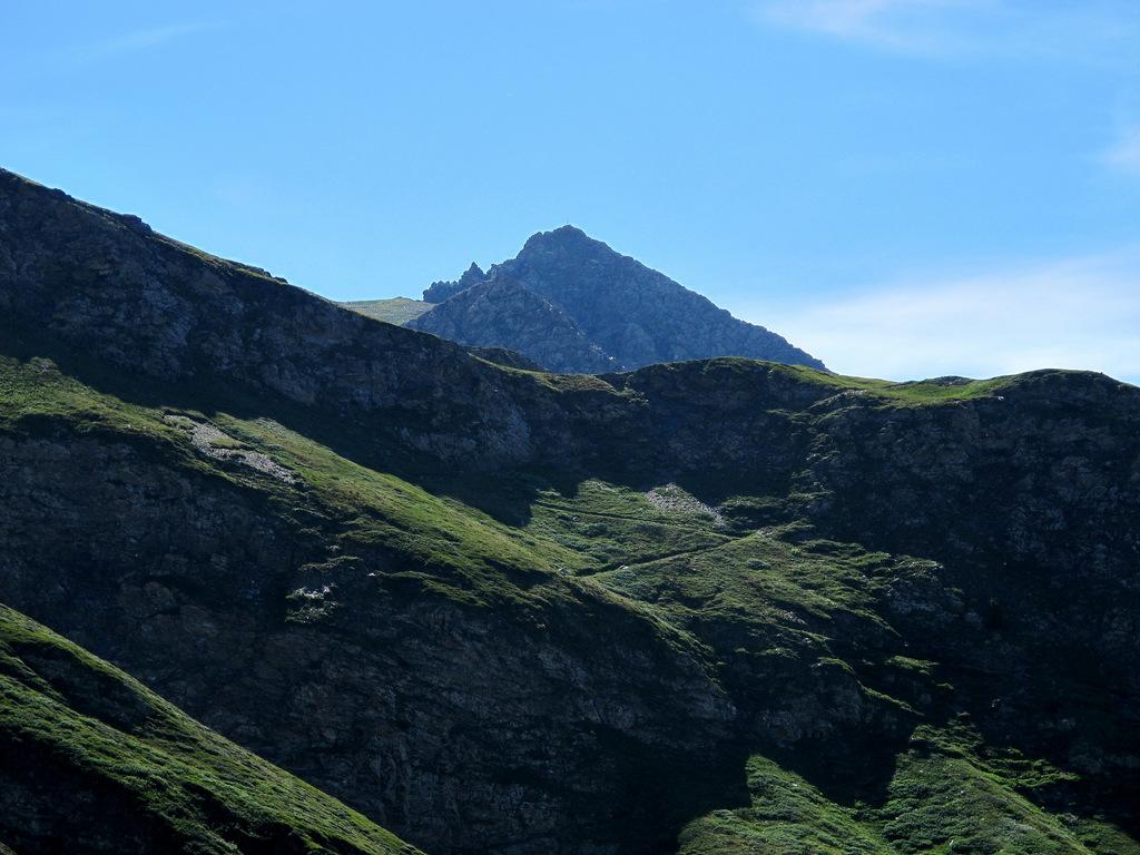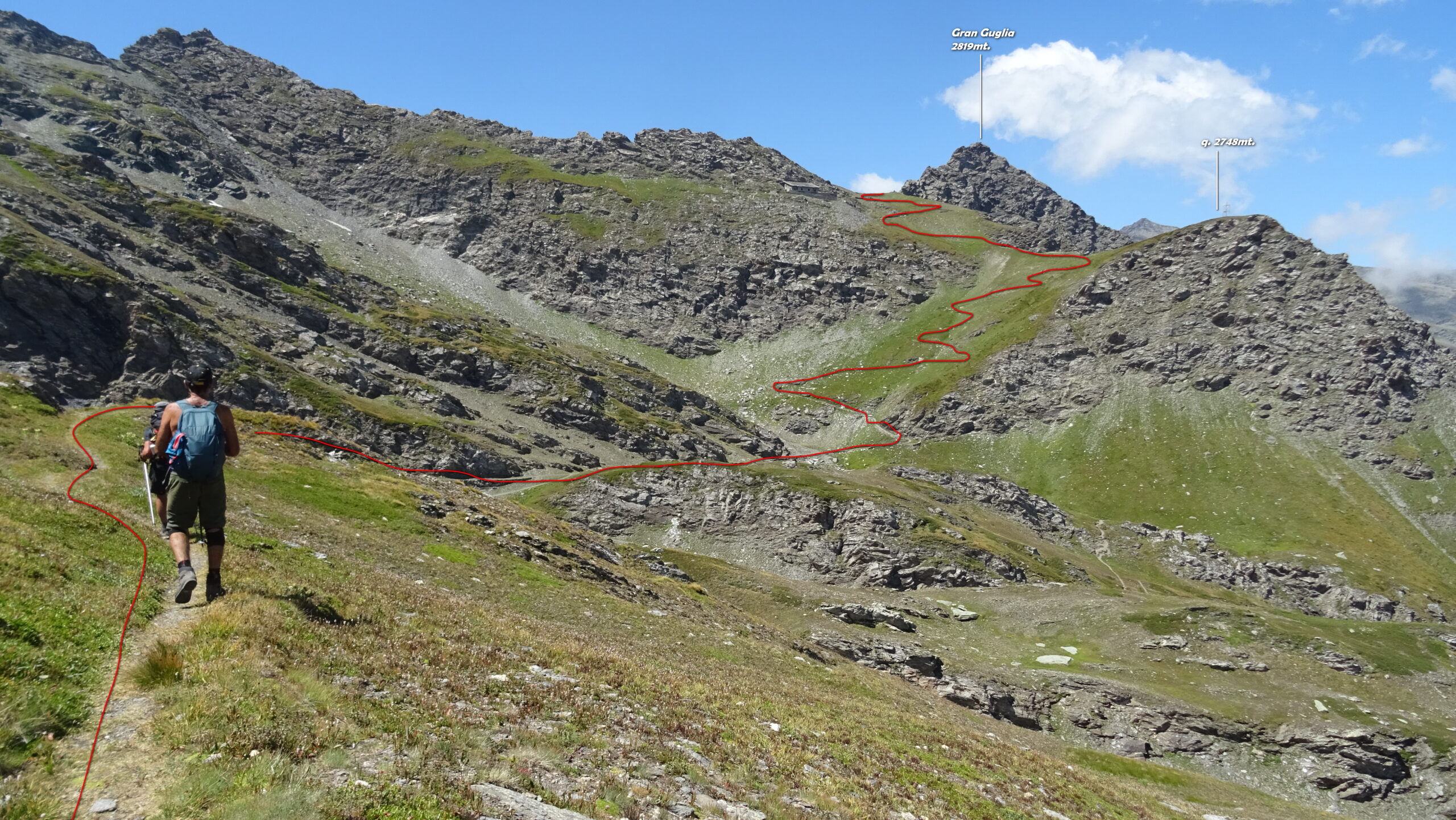 Da Bout du Col, nei pressi del laghetto dove si lascia l’auto, imboccare la larga pista 208 che si allontana in direzione Sud e in circa 2 ore porta al Rifugio del Lago Verde (quota 2583). Dal rifugio proseguire in direzione NE su sentiero GTA verso il colletto della Gran Guglia di quota 2790. Dal colletto abbassarsi per tracce sulla sinistra (bolli rossi) e rimontare l’infido pendio fino alla croce di vetta.