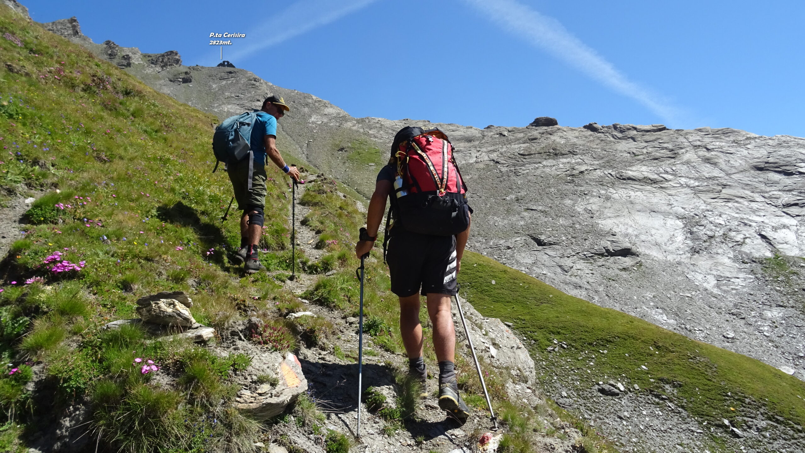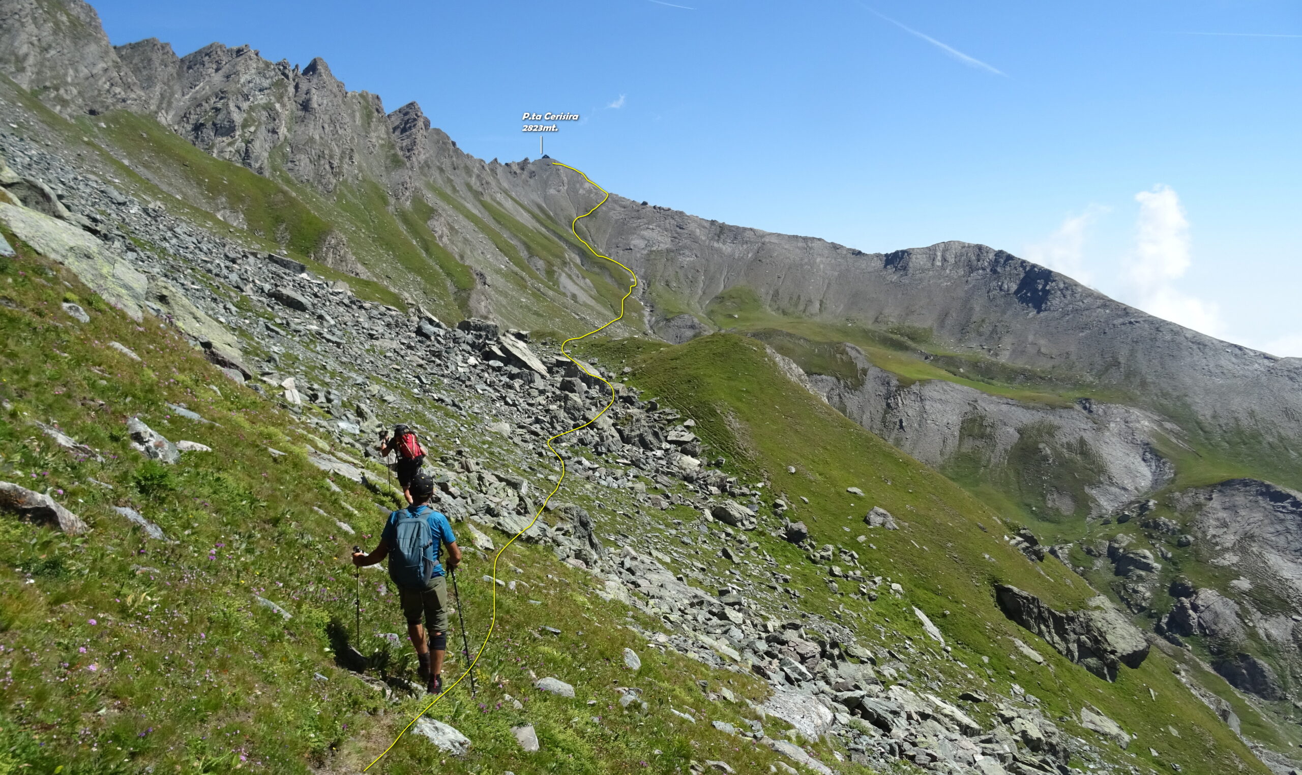 Ritornati al colle scendere sul versante opposto toccando lo spiazzo della campana poco sotto e seguendo il GTA fino ad un bivio. Qui si lascia il GTA e si imbocca a destra una vecchia strada militare che si alza obliquamente sotto i contrafforti della lunga cresta NE del Bric Boucie. La strada termina su un colle, ai piedi del rudere di Punta Cerisira (quota 2822), che dà ampia vista sulla testata della Val Pellice. Continuare sul sentiero lato Val Pellice e dopo pochi metri ((segni bianco-rossi) intraprendere il lungo e in alcuni punti precario traverso che conduce al colle Banciet (innominato su IGC), a Ovest di Punta Fionira. La traccia rimonta il versante meridionale della montagna e arriva in pochi minuti alla panoramica cima (quota 2776).